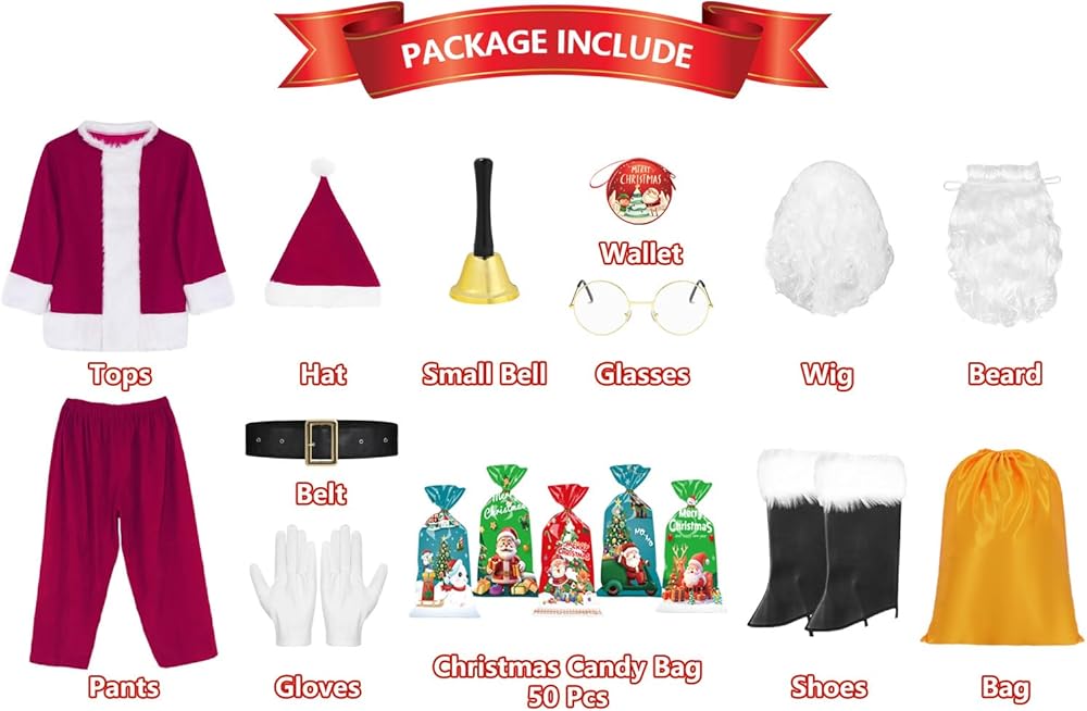 مجموعة أزياء سانتا كلوز المكونة من 13 قطعة تتضمن: 1 × قميص سانتا باللون الأحمر الخمري + 1 × بنطلون أحمر نبيذي + 1 × قبعة سانتا + 1 × جرس + 1 زوج من القفازات + 1 × باروكة سانتا + 1 × نظارات ذهبية + 1 × حزام + 1 × حذاء + 1 × لحية سانتا + 1 × حقيبة ذهبية + 1 × محفظة (لون عشوائي) + 1 × كيس حلوى (50 قطعة في العبوة). زي سانتا كلوز المكون من 13 قطعة للرجال بما في ذلك كل ما تحتاجه لأزياء سانتا كلوز، رائع لجميع احتفالات عيد الميلاد والتجمع العائلي