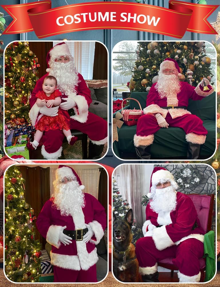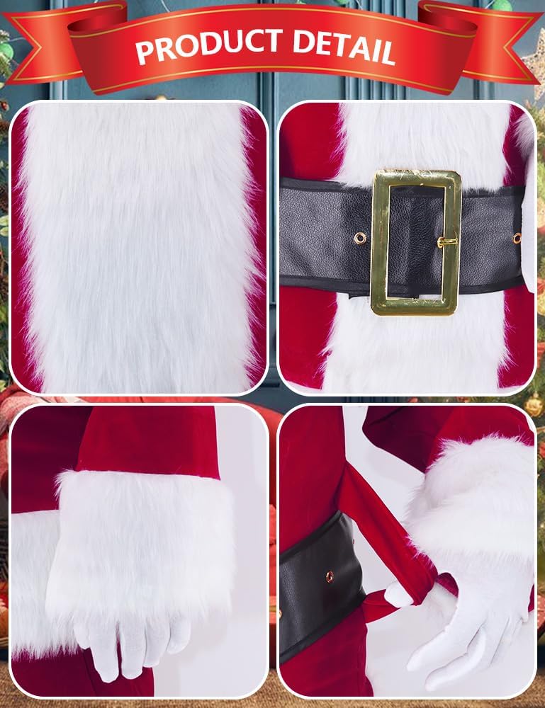 خامة فاخرة: زي سانتا كلوز للبالغين الخاص بنا مصنوع من مواد بوليستر ومخملية فائقة الجودة. جميع المعطف والقبعة مزخرفة بفرو صناعي أبيض، مما يحافظ على الدفء ويضيف لمسة إضافية من الأناقة والأصالة، مما يخلق مظهرًا احترافيًا وواقعيًا لبدلة سانتا كلوز وهو رائع لعيد الميلاد