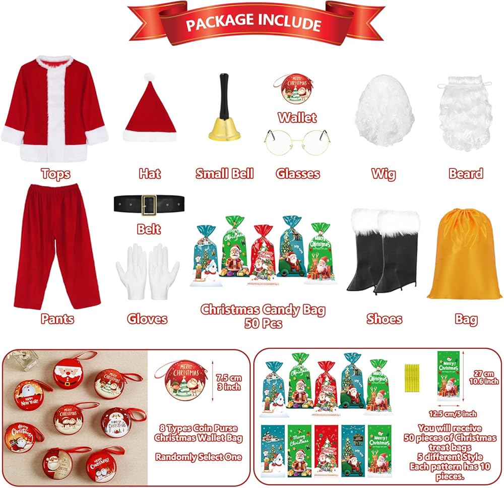 مجموعة أزياء سانتا كلوز المكونة من 62 قطعة تتضمن: 1 × قميص سانتا أحمر + 1 × بنطلون أحمر + 1 × قبعة سانتا + 1 × جرس + 1 زوج من القفازات + 1 × باروكة سانتا + 1 × نظارات ذهبية + 1 × حزام + 1 × حذاء + 1 × لحية سانتا + 1 × حقيبة ذهبية + 1 × محفظة (لون عشوائي) + 1 × كيس حلوى (50 قطعة في العبوة). لدينا 62 قطعة من زي سانتا كلوز للرجال بما في ذلك كل ما تحتاجه لأزياء سانتا كلوز، رائع لجميع احتفالات عيد الميلاد والتجمع العائلي