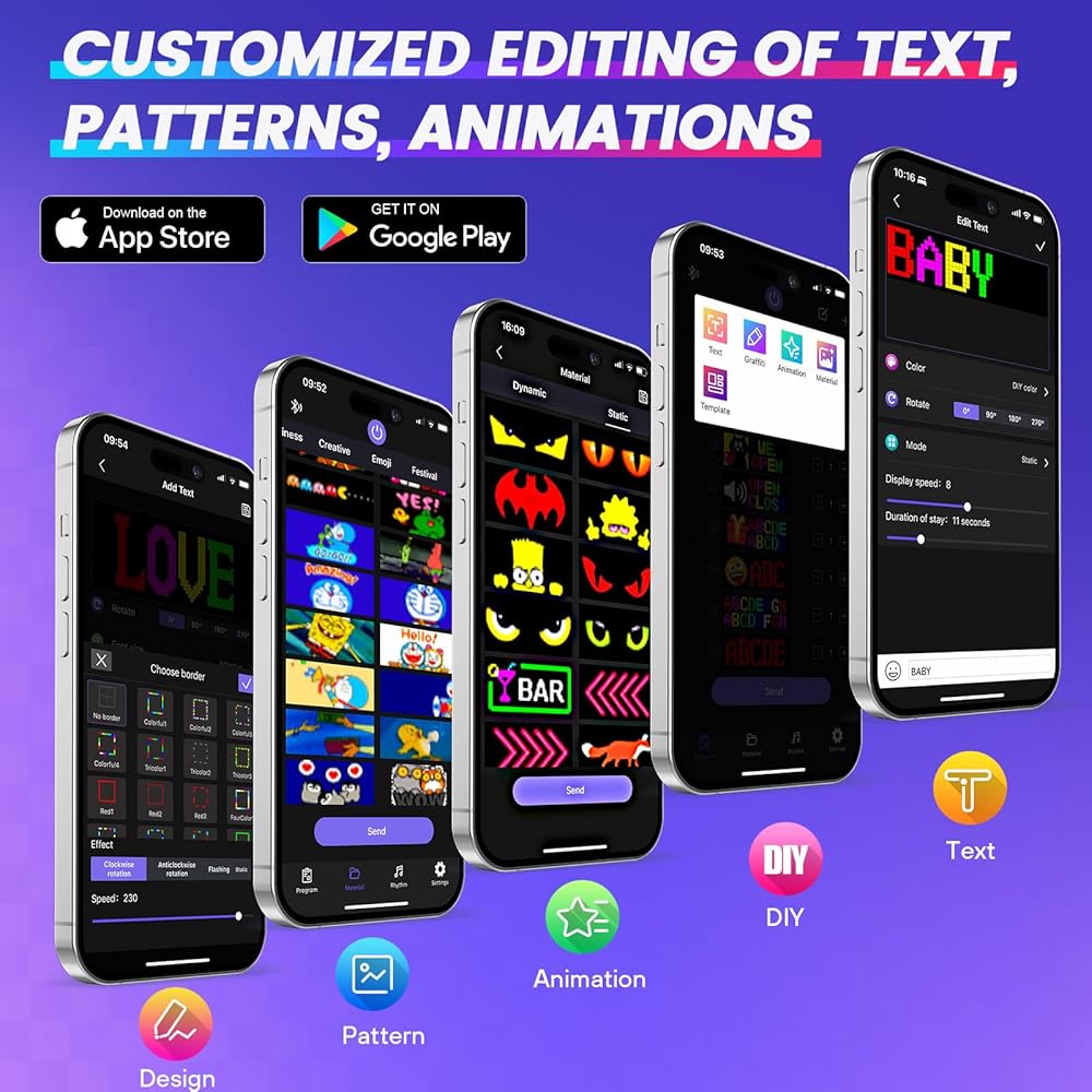 وظيفة مخصصة: يتم التحكم في علامة LED القابلة للبرمجة من خلال تطبيق متصل بالبلوتوث، والذي يمكنه تخصيص الصور والنصوص والأنماط والرسوم المتحركة! يمكنك تصميم النمط والشعار الحصريين الخاصين بك وفقًا لإبداعك وأفكارك، ويمكنك أيضًا تعديل المحتوى والأفكار التي تريدها وفقًا لمشهد الاستخدام، مما يزيد بشكل كبير من متعة علامة LED.