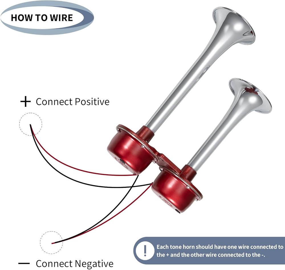 【سهلة التركيب】لا حاجة لمصدر الهواء داخل السيارة. ما عليك سوى توصيل كابلي طاقة كما هو موضح في الشكل، ثم قم بتأريض دعامة البوق بالجزء المعدني من إطار السيارة بما في ذلك جميع ملحقات التثبيت.