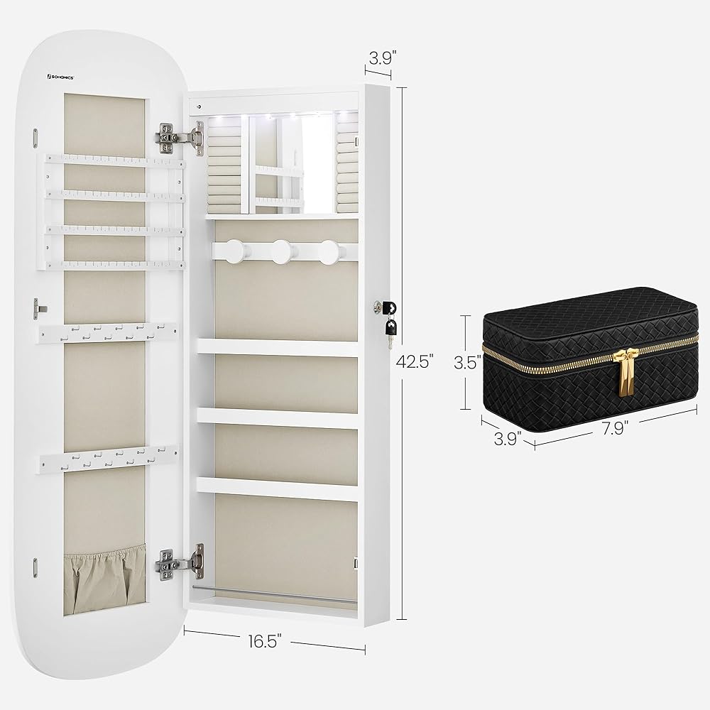 【مرآة داخلية مضيئة】تحتوي خزانة المجوهرات على مرآة داخلية، مما يزيل الحاجة إلى فتح وإغلاق الباب باستمرار لرؤية نفسك أثناء روتين المكياج. مقترنًا بمصابيح LED ذات مظهر طبيعي، فهو الرفيق المثالي للمكياج