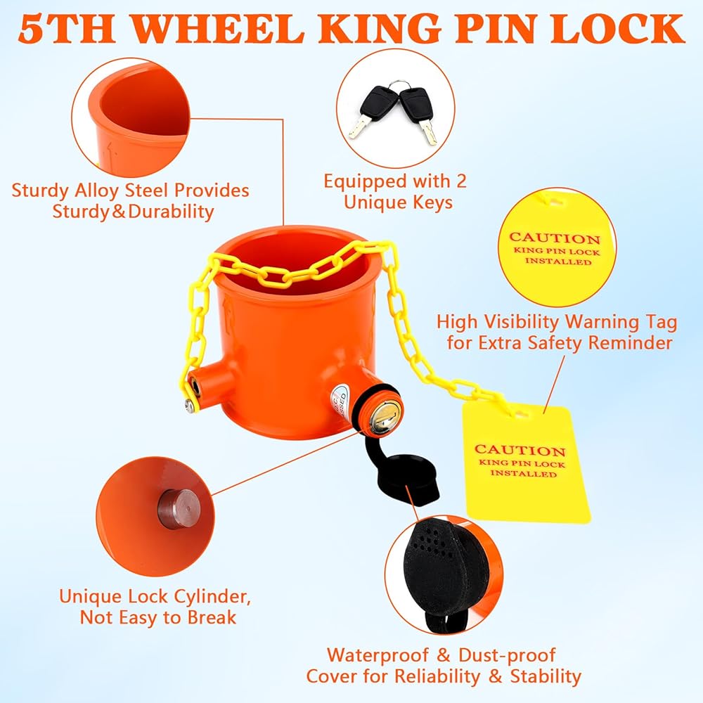 🏕️【HIGH VISIBILITY】------The wheel kingpin lock equipped with a yellow fluorescent warning label helps prevent accidents that could damage your vehicle while your RV king pin lock is engaged;as they prevent the trailer from becoming detached while on the road.High Visibility Warning Tag for Extra Safety Reminder.