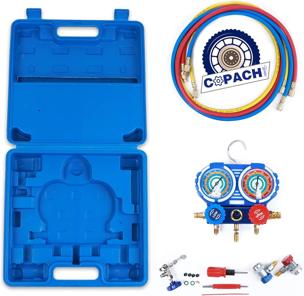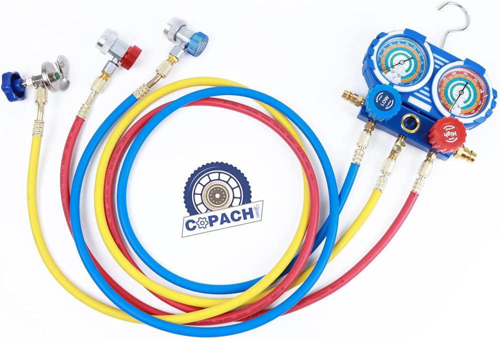 مجموعة قياس مشعب التيار المتردد - مجموعة قياس مشعب تشخيص التيار المتردد من COPACHI مع محول خراطيم 5FT، موصلات خرطوم 1/4 بوصة، مجموعة مقاييس التيار المتردد، مبرد R134A R12 R22 R502، علبة زرقاء