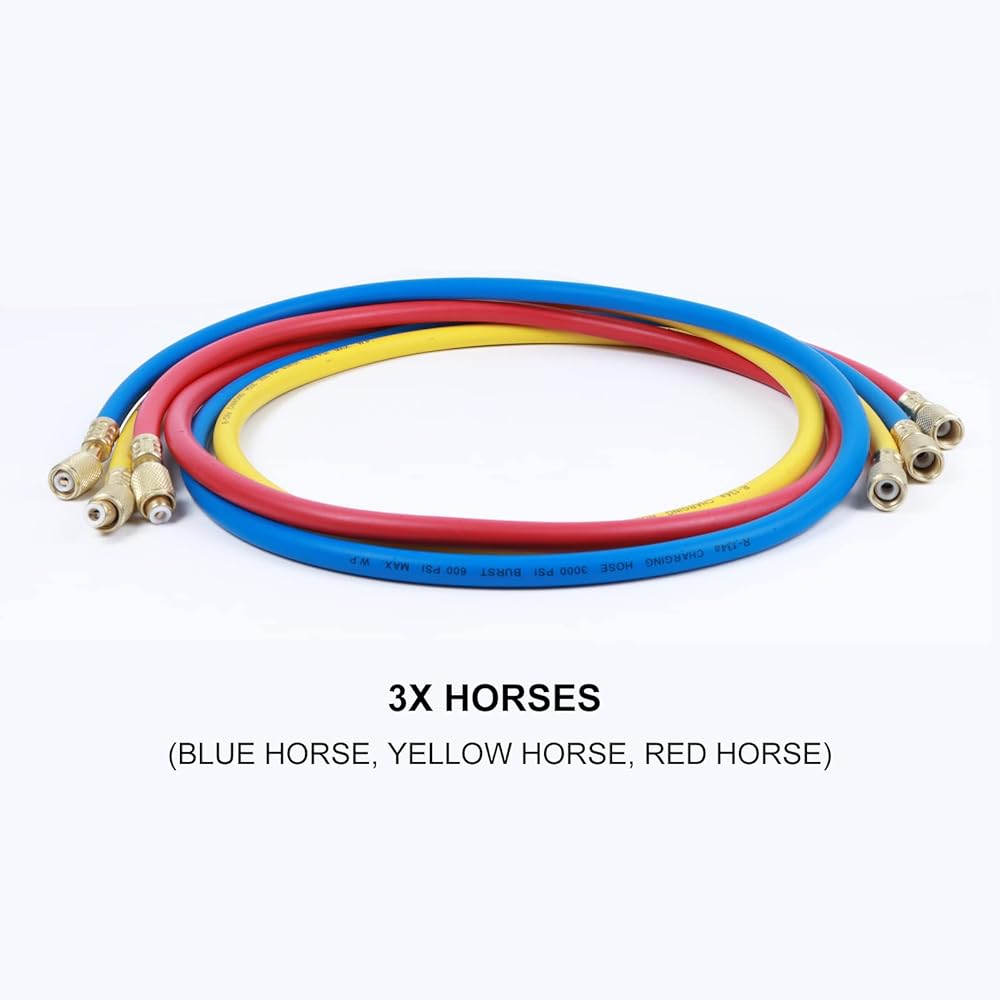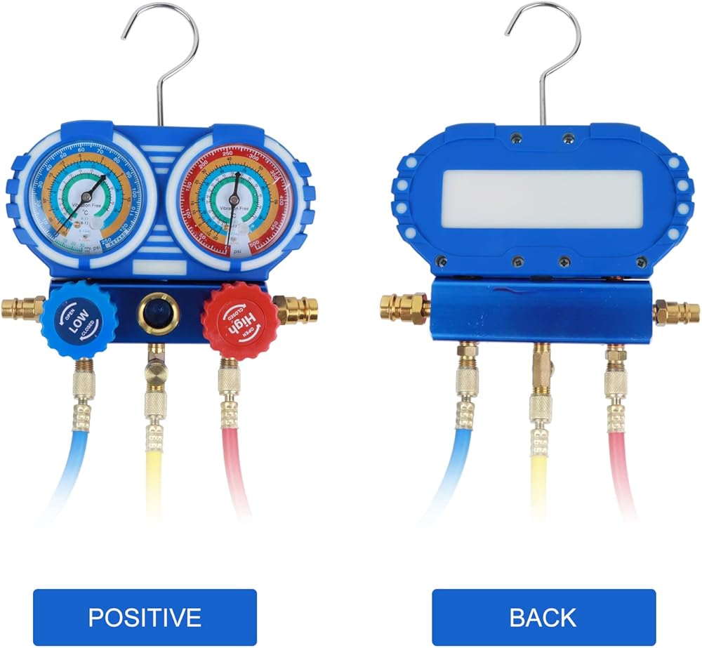 【FEATURE】The main components as follows: hook, low pressure meter-blue, high pressuremeter-red, low voltage interface, high voltage interface, filler, high and low pressure handle(optionalaccessories,high pressure hose-tricolor tube,high and low voltage fast joint). the hose is made of high-quality thickened rubber material, which can withstand pressure, high temperature and corrosion, with easy and simple connection and good sealing.