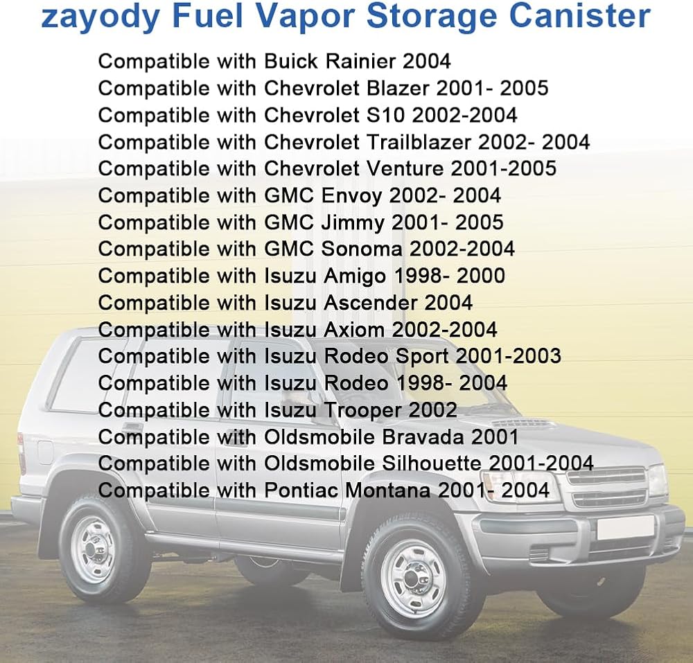 Applicable Models: The vapor canister compatible with Buick Rainier Isuzu Ascender 2004, Chevrolet Blazer Venture GMC Jimmy 2001-2005, Chevrolet S10 Trailblazer GMC Envoy Sonoma Isuzu Axiom 2002-2004, Isuzu Amigo 1998-2000, Isuzu Rodeo Sport 2001-2003, Isuzu Rodeo 1998-2004, Isuzu Trooper 2002, Oldsmobile Bravada 2001, Oldsmobile Silhouette Pontiac Montana 2001-2004