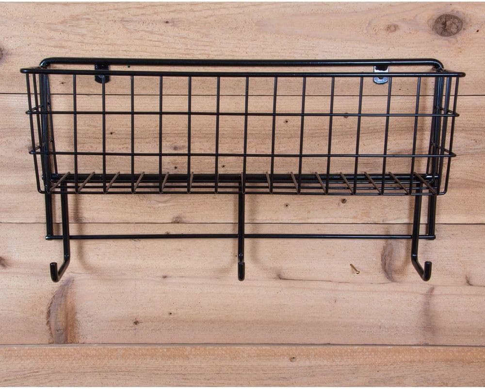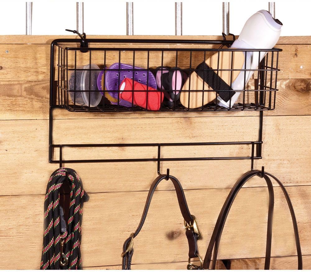 يحافظ هذا الرف على تنظيم معدات حصانك اليومية بشكل أنيق على مقدمة المماطلة. تتميز السلة السلكية بقدرة تحمل كبيرة ويمكنها تخزين الزجاجات بسهولة بينما تحمل الخطافات الثلاثة الموجودة بالأسفل المسكة والأرسنة والرصاص.