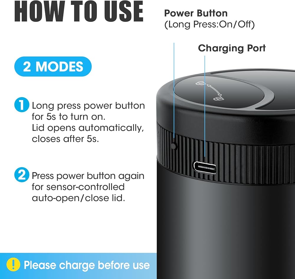 • ♛ Mode Switching: This car ashtray box comes with two modes. Long press to activate mode one: automatically recognizes opening and closes after five seconds. Short press to switch to mode two: recognizes opening and closing.
