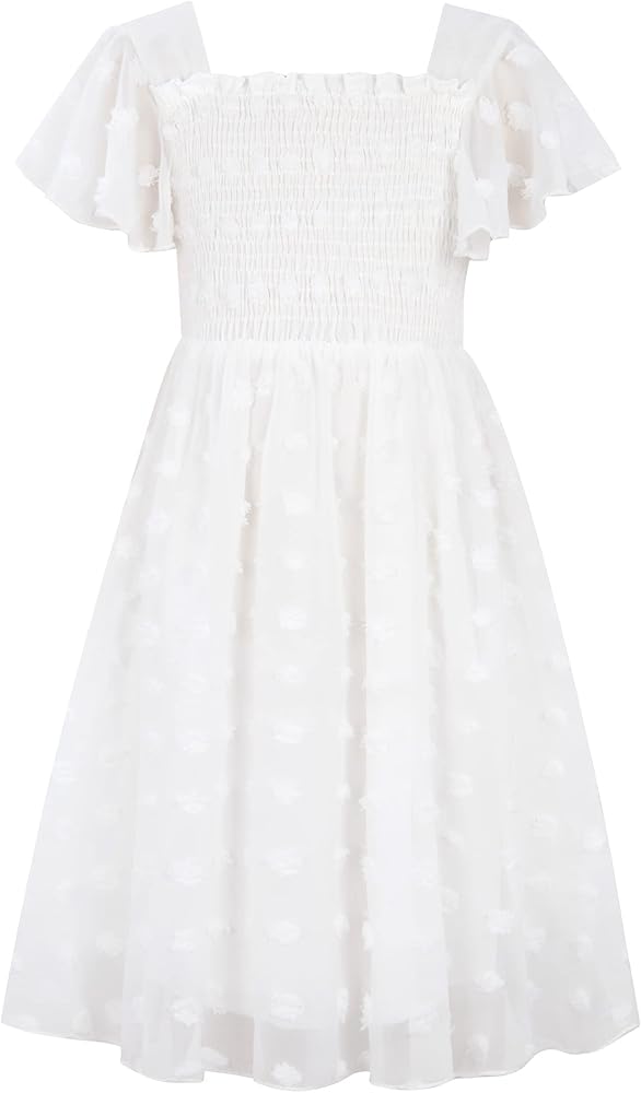 • ☀ تصميم رائع -- الفستان المنقط السويسري ذو اللون الصلب مزين بكرات بوم لطيفة، وتصميم الياقة المربعة المكشكشة والأكمام المرفرفة والجزء العلوي المرن المطوي، يجعل فتاتك تبدو جميلة وأنيقة، وتصبح الأكثر إبهارًا في حشد.