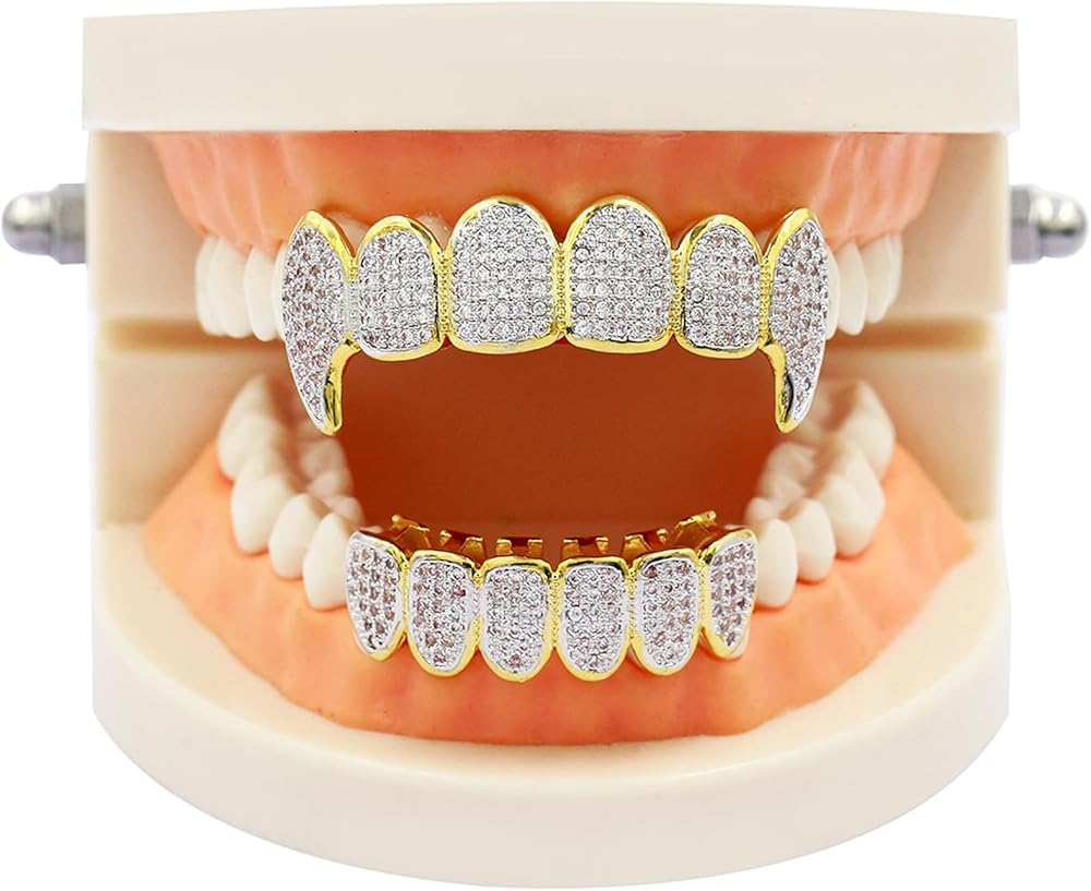 مجموعة جديدة وثلجية - تتميز شوايات أسنان مصاصي الدماء الذهبية بشوايات من مادة النحاس المعدنية الفاخرة المطلية بالذهب عيار 18 قيراط للأسنان و244+قطعة 5A+ زركونيا مكعب لامع، خالية من الرصاص والنيكل، صديقة للبيئة.