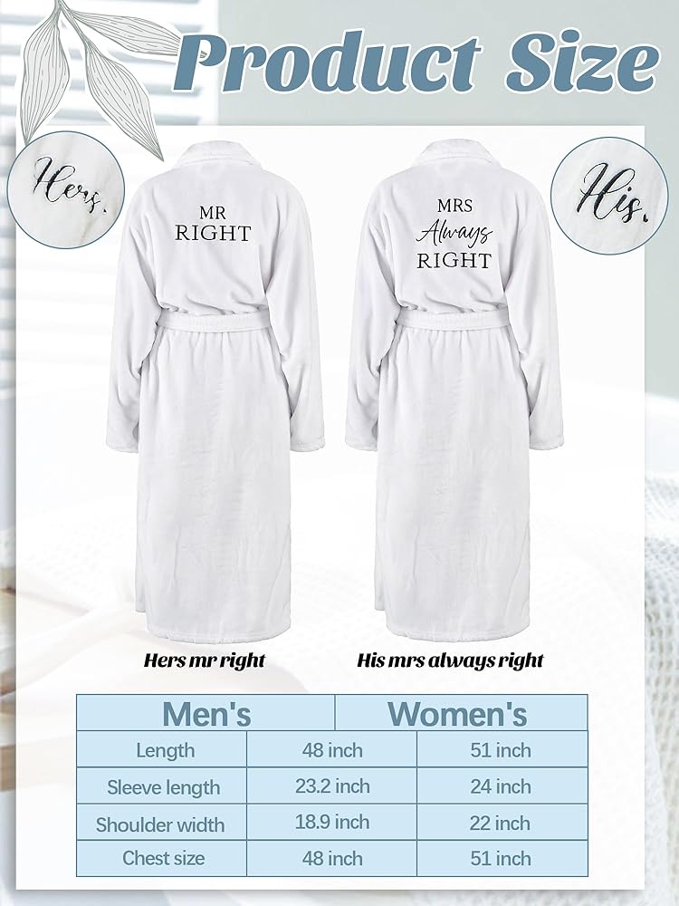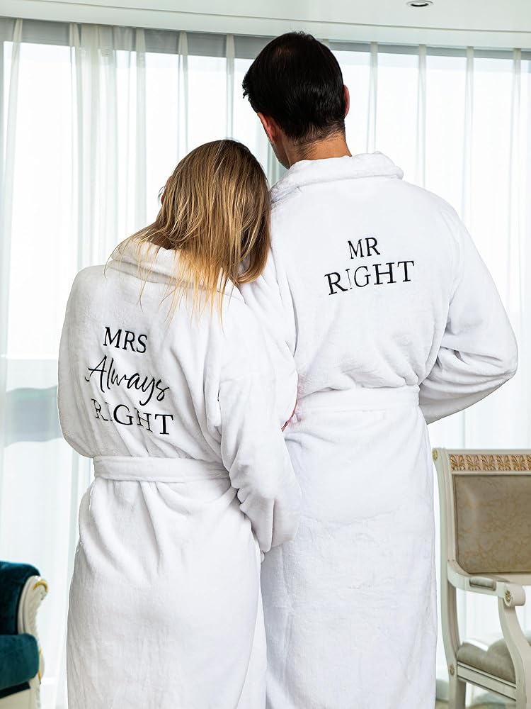 • Stylish Composition: our couples robes showcase a nice charm with the men's robe embroidered "Mr. Right" on the back and "his" upfront while the women's robe features "Mrs. Always Right" on the back and "hers" upfront; Their simplistic elegance is further enhanced by a kimono-style collar and a couple of convenient pockets for personal items