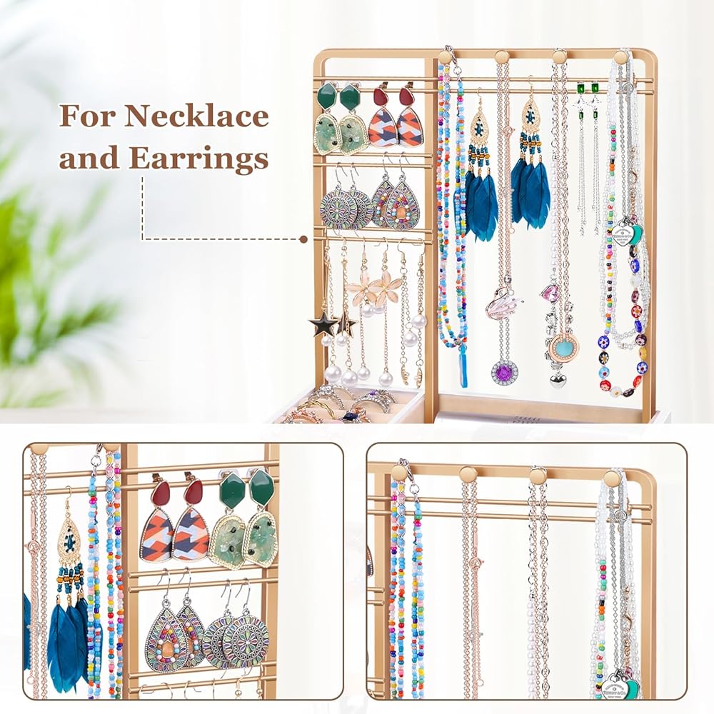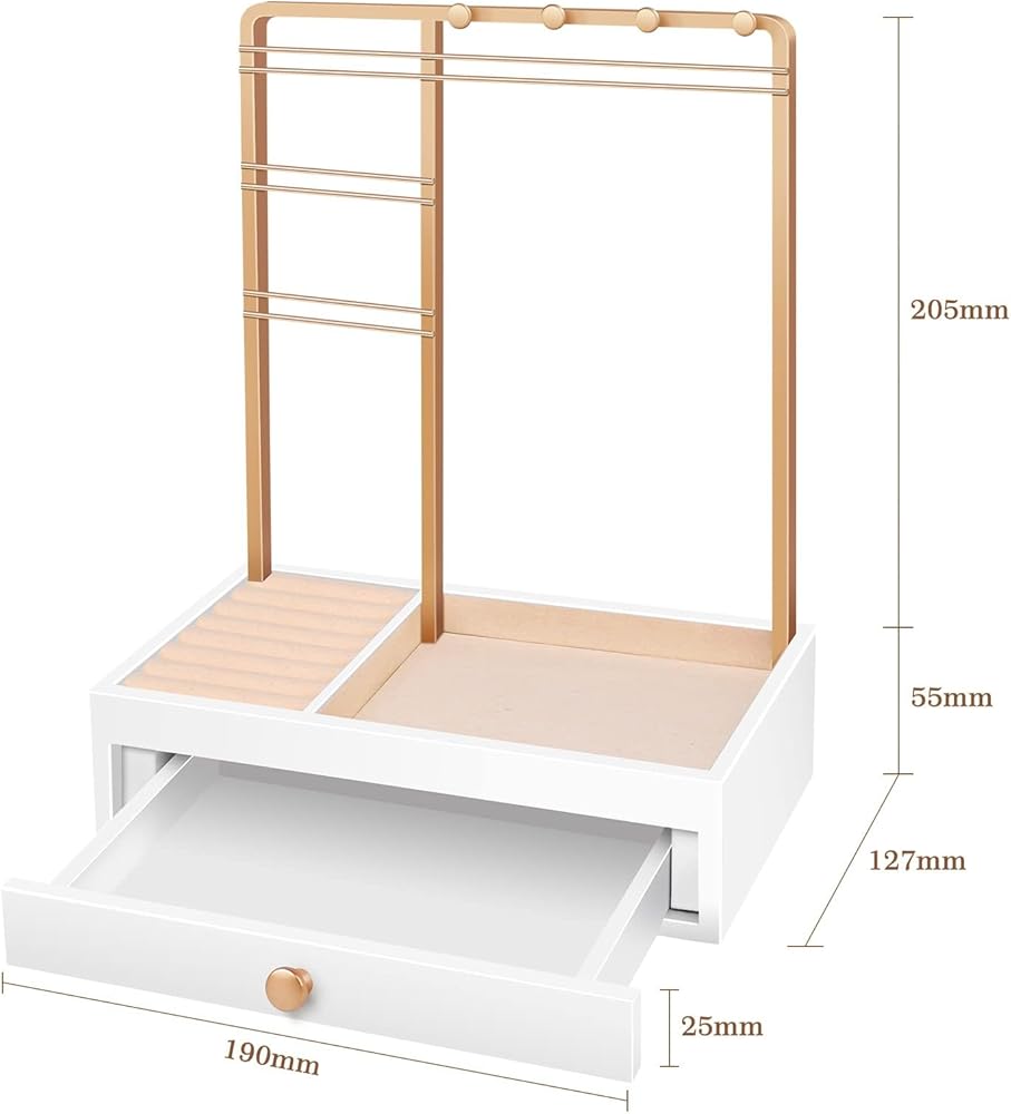 • ♔[تصميم جميل]: مصنوع من الخشب والمعدن البرونزي، حامل شجرة المجوهرات هذا هو تصميم أنيق وبسيط، وسيتناسب اللون والتصميم مع ديكور غرفتك تمامًا.