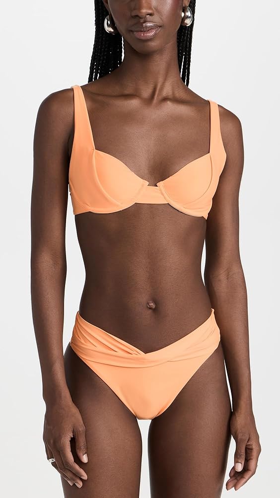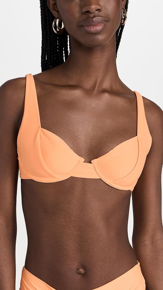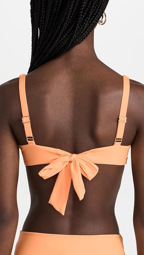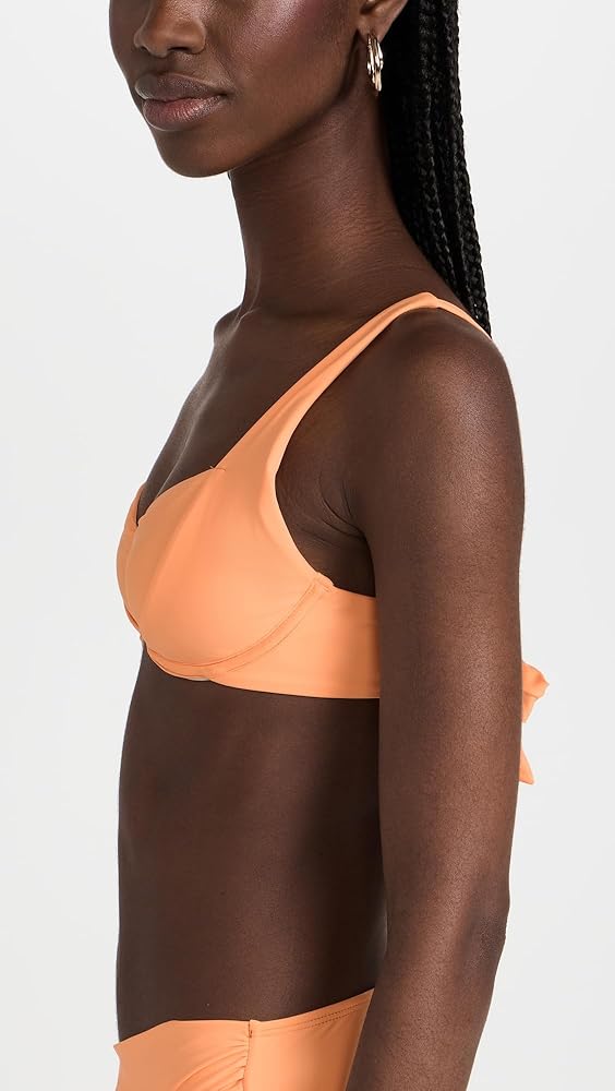 A vividly colored solido bikini top, featuring wide shoulder straps, underwire cups, and ties in back.