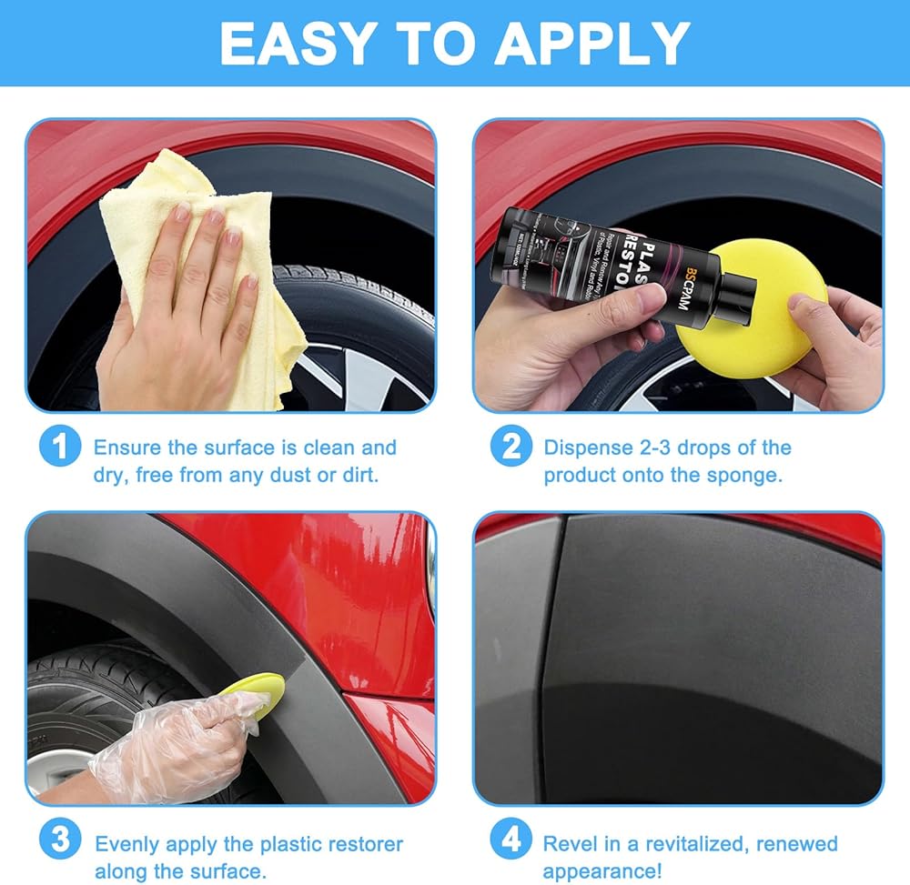 𝐇𝐢𝐠𝐡𝐥𝐲 𝐂𝐨𝐧𝐜𝐞𝐧𝐭𝐫𝐚𝐭𝐞𝐝 𝐚𝐧𝐝 𝐄𝐚𝐬𝐲 𝐭𝐨 𝐔𝐬𝐞— لا يلزم سوى بضع قطرات من هذه التركيبة المركزة للمساحات الكبيرة. ببساطة استخدمي الإسفنجة المرفقة لوضع طبقة متساوية، ثم امسحي الفائض. إنه يعيد البلاستيك الباهت إلى لونه الأسود الأصلي مع توفير طبقة واقية ضد أضرار الأشعة فوق البنفسجية والتشقق والبهتان.