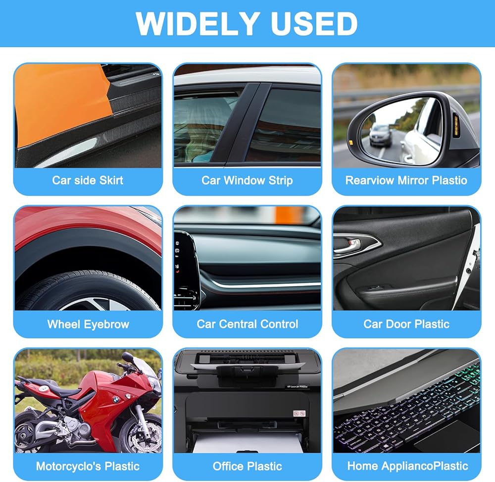 مرمم البلاستيك هذا مثالي لمجموعة واسعة من الأسطح البلاستيكية السوداء للسيارات، بما في ذلك المصدات والمرايا وتزيين النوافذ ومقابض الأبواب ولوحات القيادة، أكثر. قم بتجديد وحماية وإطالة عمر الأجزاء البلاستيكية لسيارتك بسهولة.
