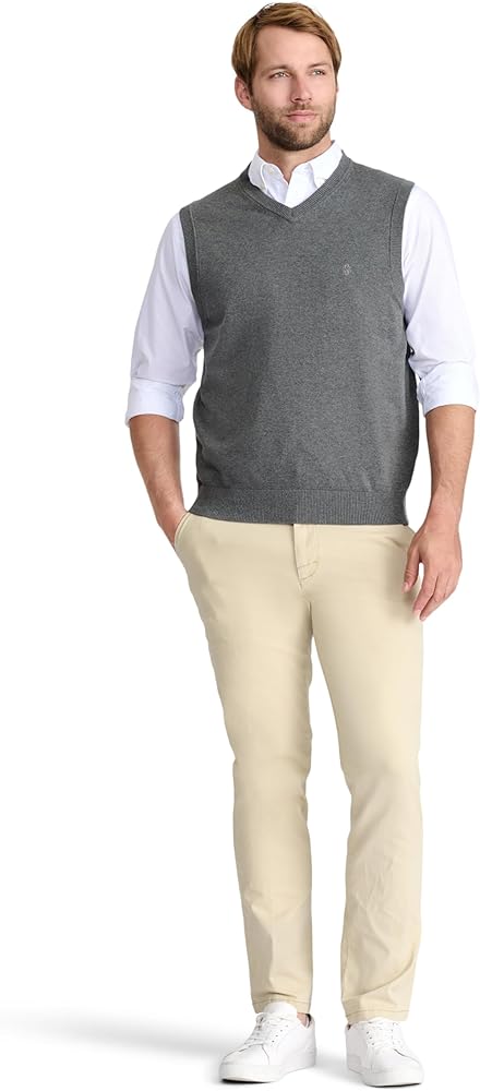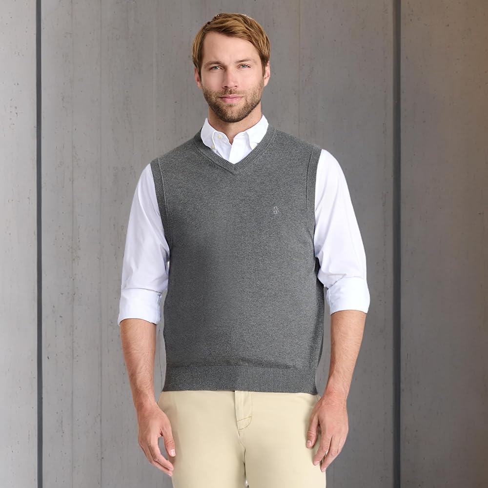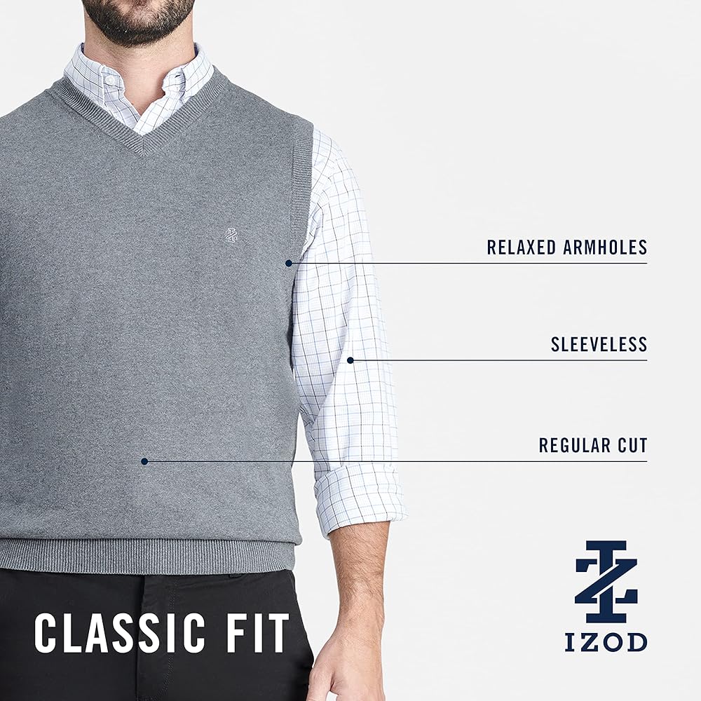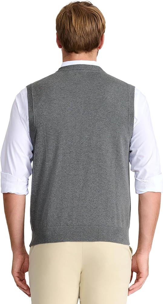 - Ribbed trim helps this v-neck sweater vest keep its shape after each wash