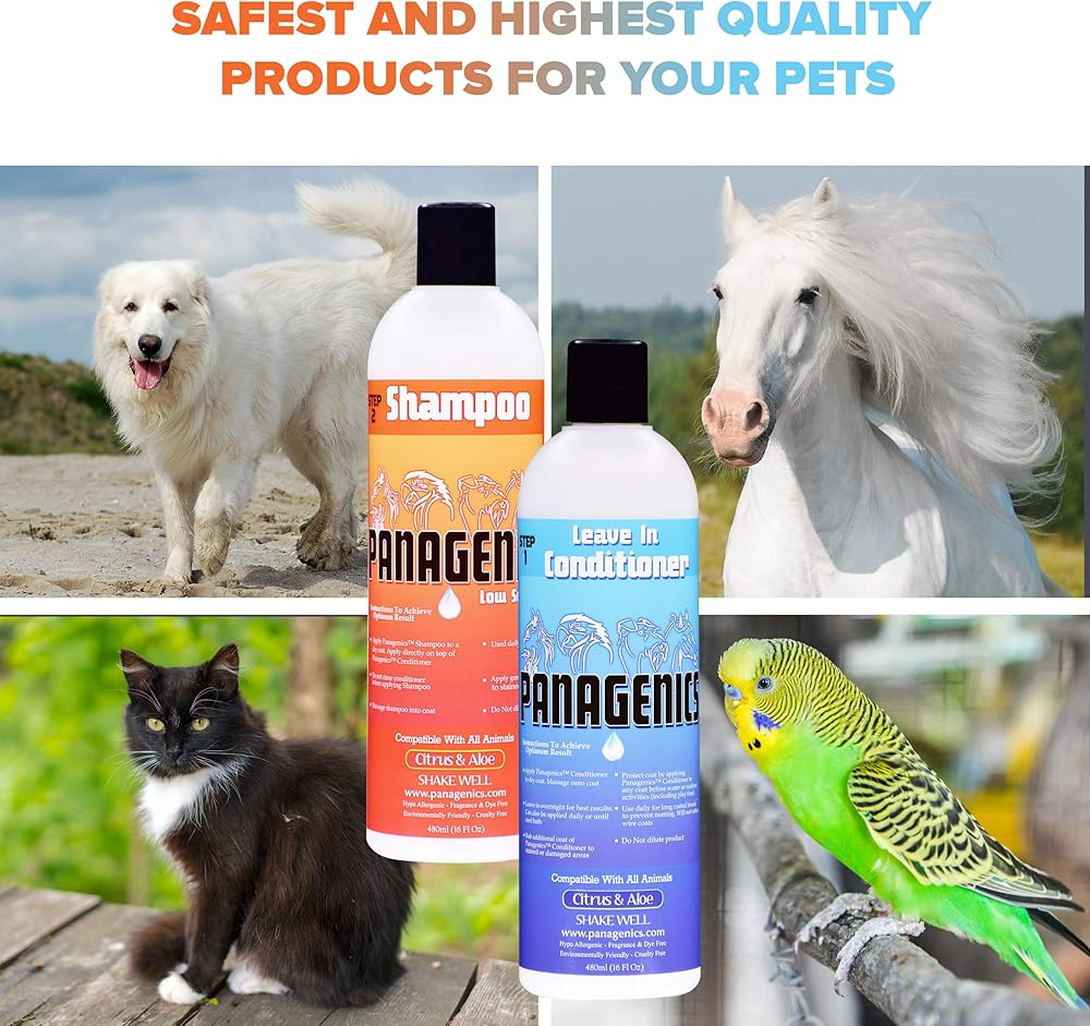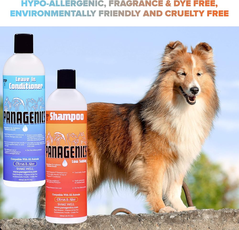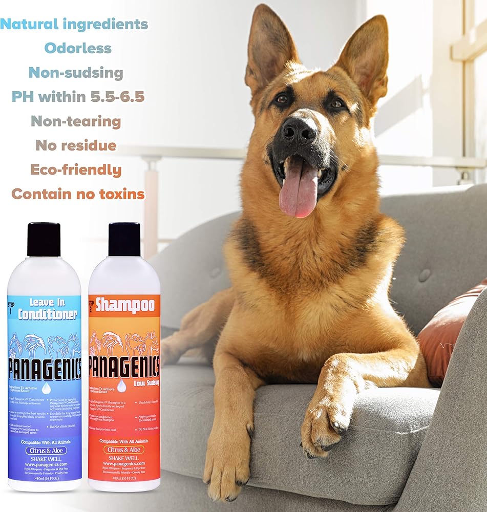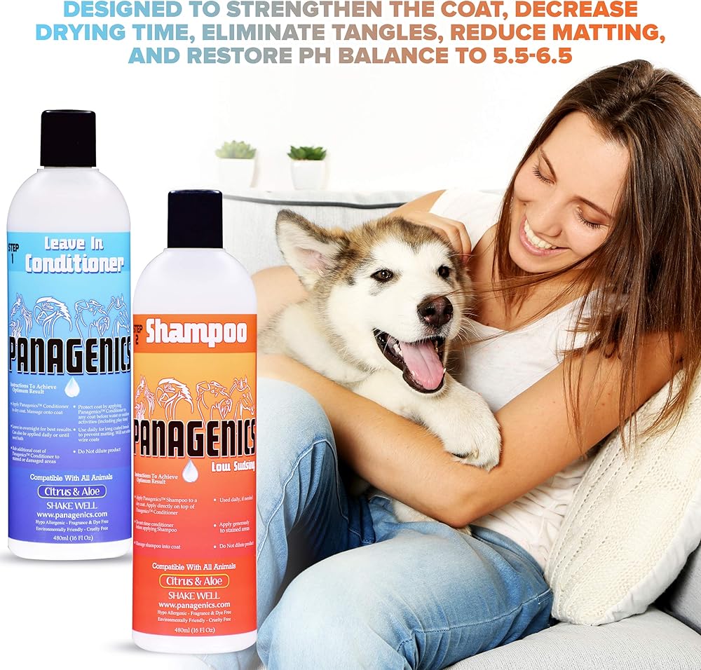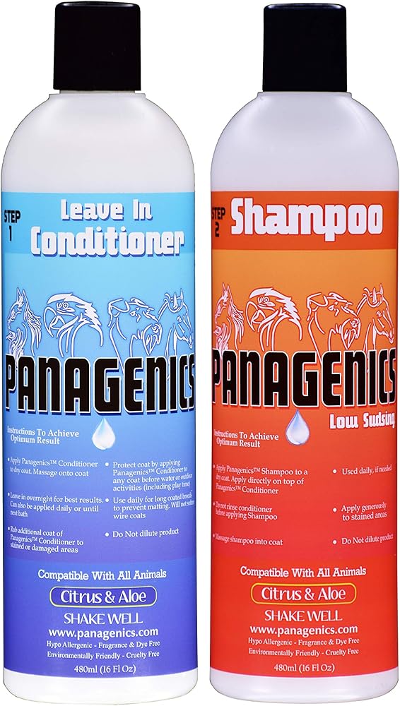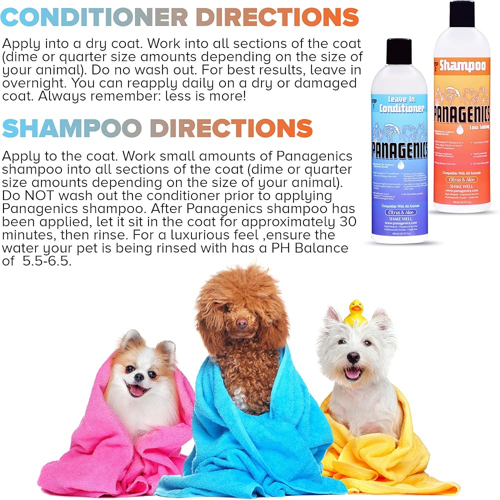 • 🐶 SHAMPOO DIRECTIONS: Apply to the coat. Work small amounts of Panagenics shampoo into all sections of the coat (dime or quarter size amounts depending on the size of your animal). Do NOT wash out the conditioner prior to applying Panagenics shampoo. After Panagenics shampoo has been applied, let it sit in the coat for approximately 30 minutes, then rinse. For best results, ensure water pH is 5.5-6.5