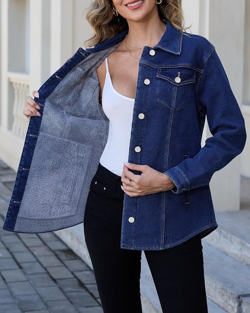 سترة نسائية مبطنة بالصوف: بعيدًا عن تصميم سترة الدنيم التقليدية، الجزء الداخلي مبطن ببطانة شيربا الحرارية باللونين الأسود والرمادي. عصري مع إضافة الدفء إلى الشتاء البارد.