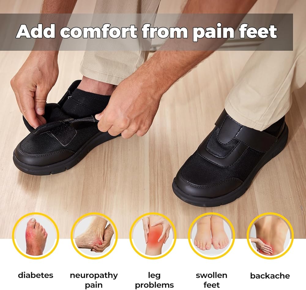 تخفيف الألم - أي شخص يعاني من مشاكل في مرض السكري أو ألم الاعتلال العصبي أو مشاكل في الساق أو آلام الظهر، فإن هذه الأحذية الرجالية المخصصة للأقدام المتورمة تساعد بالتأكيد على تخفيف الضغط على قدميك ولا تتعب من المشي طوال اليوم.
