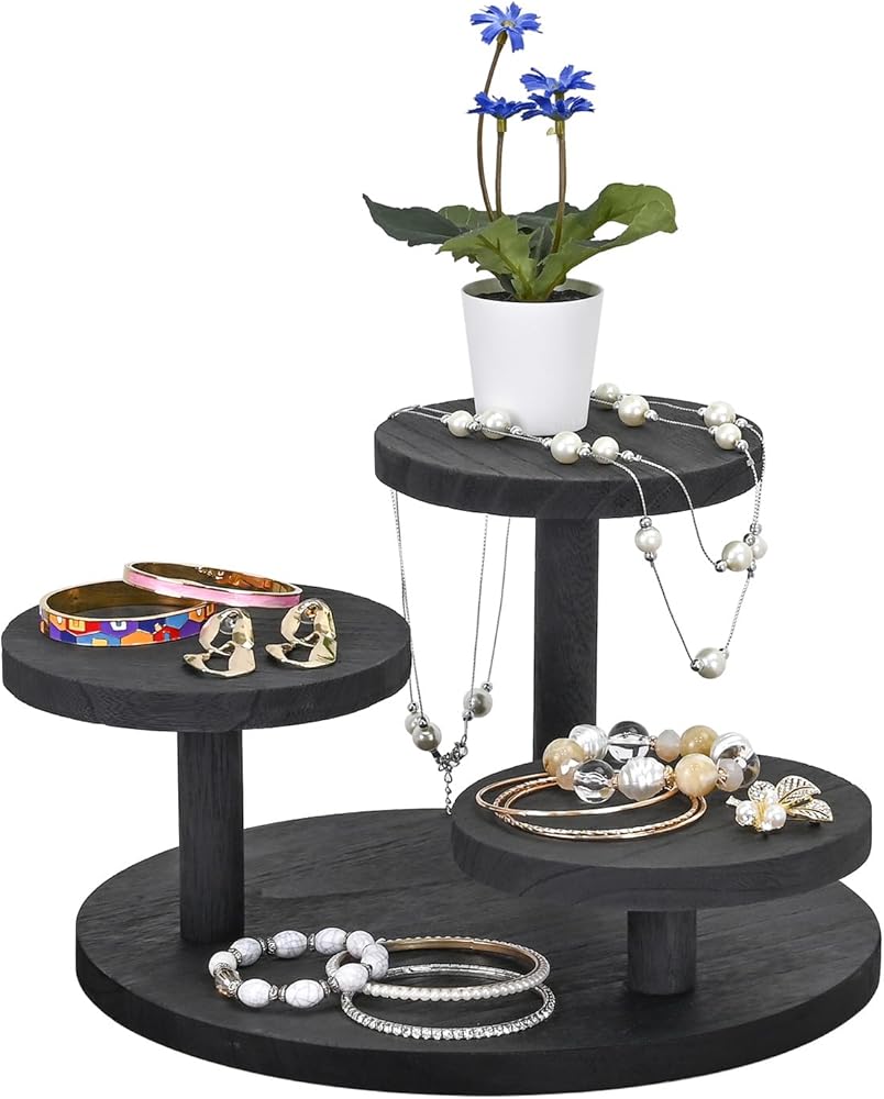 Perfect for retail stores, trade shows or personal use, this 3-Tier Wooden Display Riser includes different heights for displaying your jewelry to be attractive and beautiful. You can place cosmetics, tabletop plant, collectibles, gemstones, rocks, figurines, collectibles, perfume collection, and so on. This riser set is the best way to display your collection and they work the best in presentation and value. The wooden jewelry riser set is versatile that you can organize them any way you please.