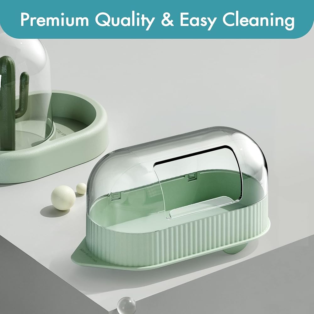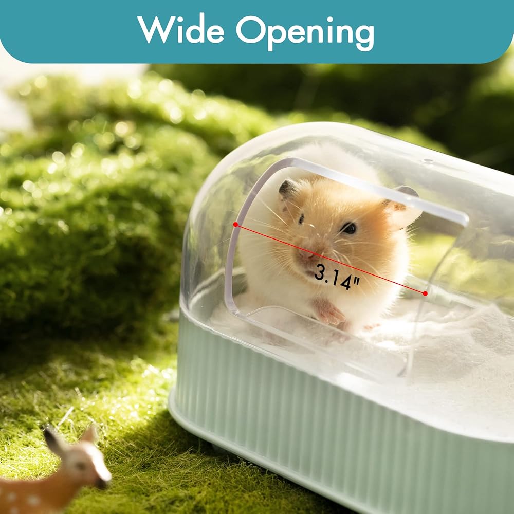 حمام الهامستر الواسع: يبلغ مقاسه 7.7 بوصة (طول) × 3.7 بوصة (عرض) × 4 بوصة (ارتفاع) مع فتحة بعرض 3.14 بوصة، وهو كبير بما يكفي لجميع أنواع الهامستر ليتلاءم بشكل مريح مع الحمام الرملي.