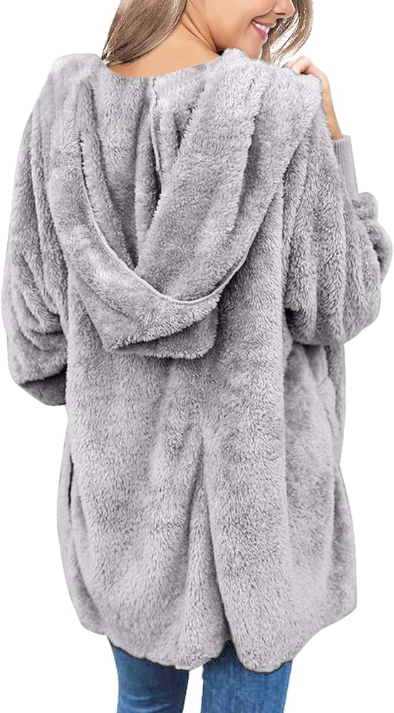 سترة نسائية كبيرة الحجم من الصوف المريح تتميز بغطاء للرأس في الخلف وتصميم مفتوح من الأمام، وأكمام طويلة مع تشطيبات مضلعة. سترة نسائية من الصوف، سترة شيربا للسيدات، معطف كارديجان نسائي كاجوال من الفرو الصناعي مع نسيج ناعم غامض. معطف نسائي بغطاء للرأس، سترة كبيرة الحجم.