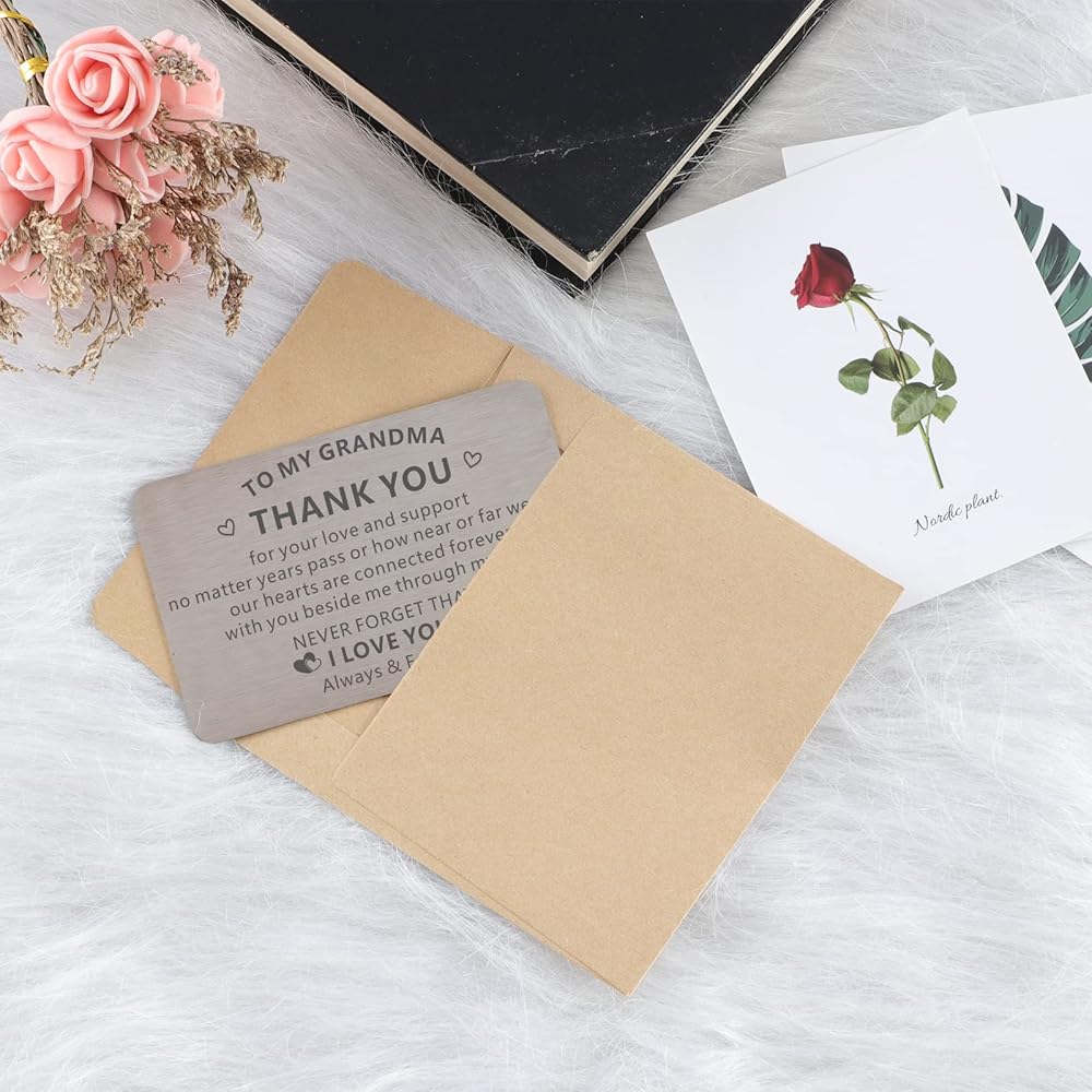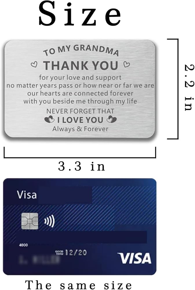 2.【Best Grandma gifts】:Give this wallet card to your grandmother. It is engraved with warm words: TO MY GRANDMA THANK YOU for your love and support no matter years pass or how near or far we are our hearts are connected forever with you beside me through my life NEVER FORGET THAT I LOVE YOU Always & Forever