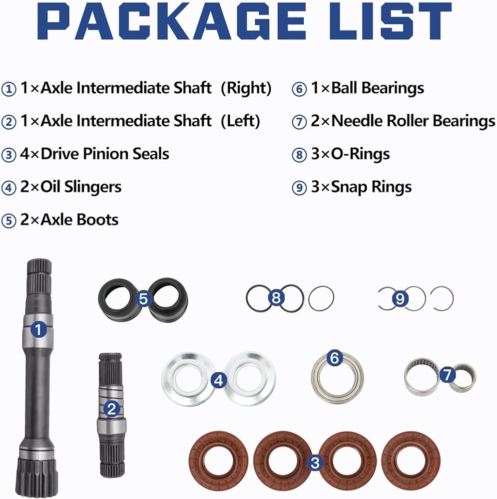 - تتضمن العبوة: محور أمامي 215 مم، نسبة محور 3.21، نسبة محور 3.55، نسبة محور 3.92، عمود داخلي، عمود محور داخلي، عمود تفاضلي داخلي، عمود داخلي تفاضلي أمامي، محور متوسط، عمود محور متوسط، عمود متوسط، عمود المحور.