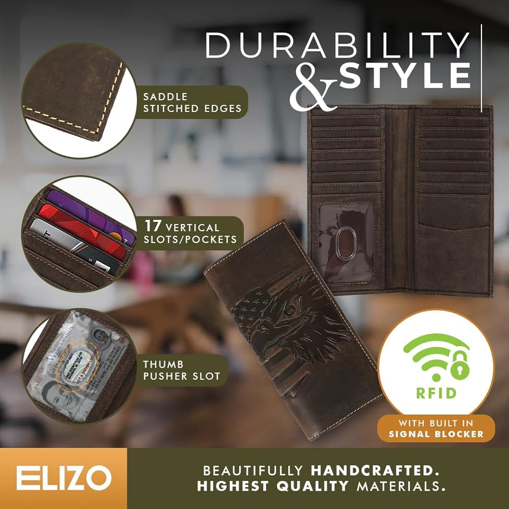 • متينة وعملية - تم تصنيعها بخبرة باستخدام مواد فاخرة فقط وحرفية دقيقة، وهي متينة لتتحمل التآكل والتمزق اليومي بسهولة، ويبلغ مقاسها 16.9 سم طولًا × 8.8 سم عرضًا، حجمًا مثاليًا للمحفظة الجلدية للرجال. تحتوي هذه المحفظة الطويلة ثنائية الطي للرجال على 17 فتحة لحمل بطاقات الائتمان، وفتحة نافذة شفافة مع أداة دفع للإبهام.
