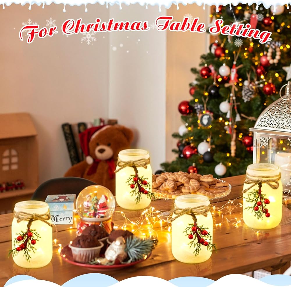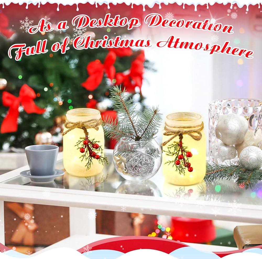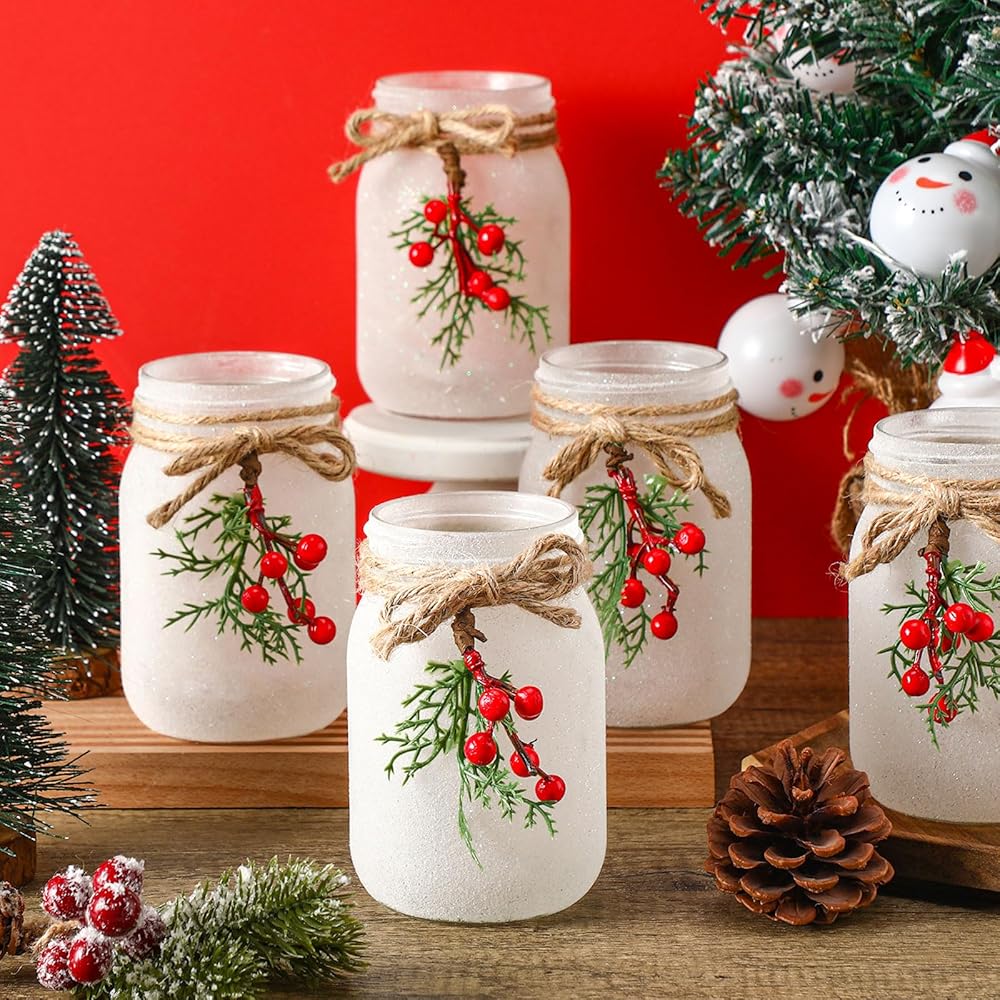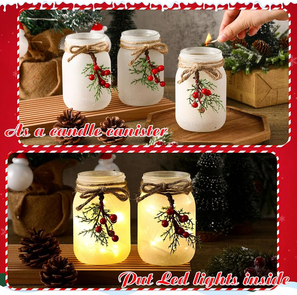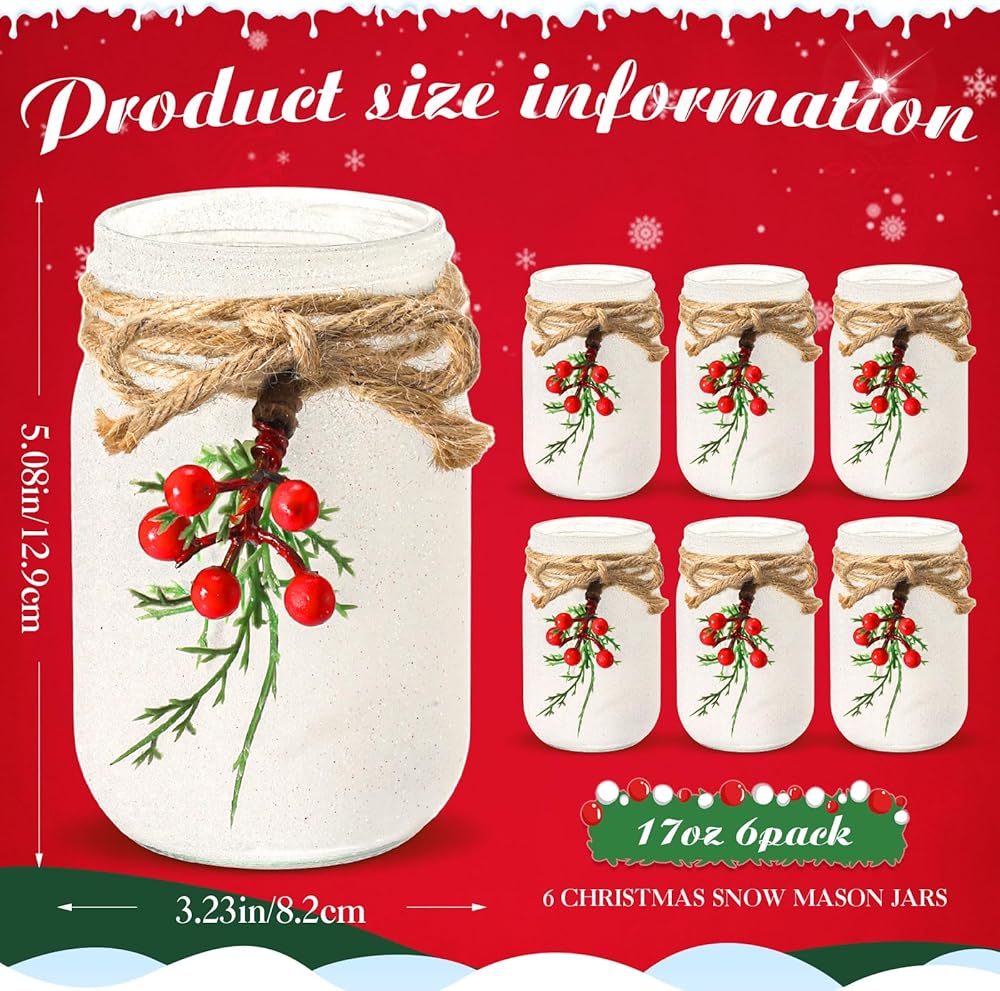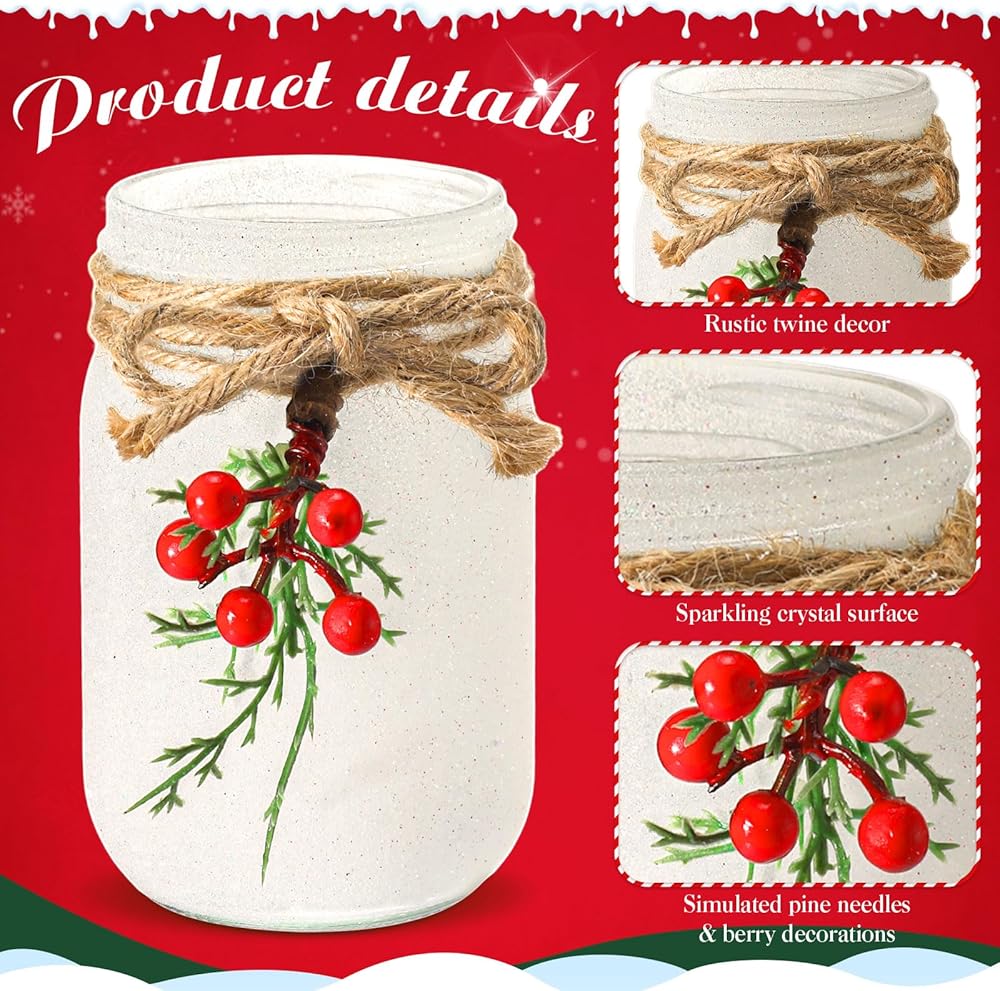 Festive Appearance: the surfaces of each Christmas empty mason jar is covered with white crystals that create a snowy ambiance; Topped with a thick twine tied in a bow and adorned with a sprig of mistletoe, exuding a strong Christmas spirit
