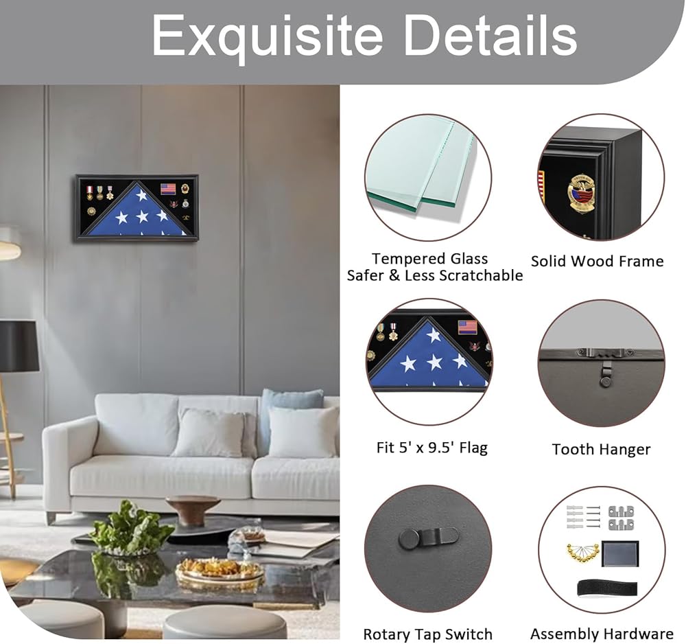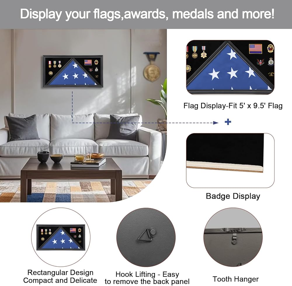 • مساحة الحجم - يبلغ حجم قسم عرض العلم في علبة عرض العلم الكبيرة Sboitflmm 17.32 × 17.32 × 25.59 بوصة، وهو مناسب للعلم المطوي مقاس 5 × 9.5 بوصة؛ يبلغ مقاس قسم عرض الميداليات والشهادات 22.83 × 11.60 بوصة، ويوفر الحجم الكبير مساحة كبيرة للتذكارات.