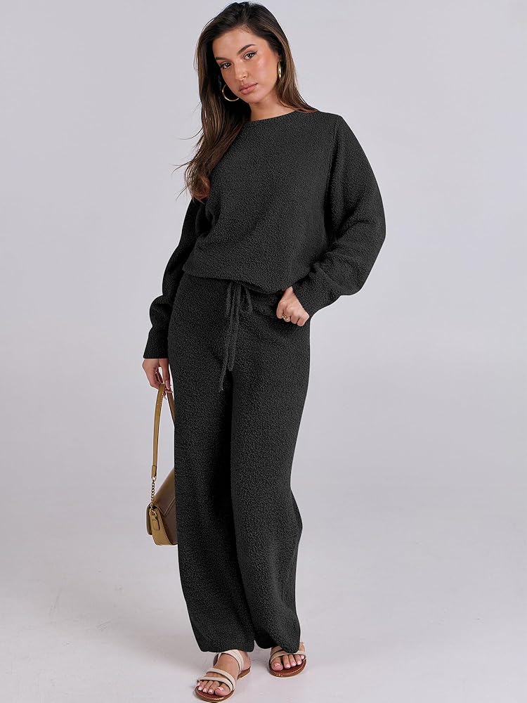 السمات: نسيج صوفي غامض، كم طويل، رقبة دائرية، خصر عالي مع رباط قابل للتعديل، حزام خصر مرن، سترة علوية، وسروال واسع الساق. مجموعة الصالة هذه مناسبة للاستخدام اليومي والمنزل وحفلات البيجامة والسفر.
