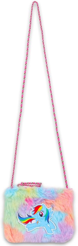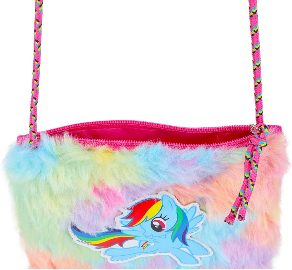 My Little Pony Crossbody Purse for Girls - MLP Mini Purse Bundle with My Little Pony Crossbody Bag for Girls Plus Stickers, More | My Little Pony Purses for Kids. This My Little Pony crossbody bag for girls includes 1 bag measuring 7" x 5.5" x 2" with colorful artwork of Rainbow Dash, a zip closure compartment, and a long strap, perfect for wearing around your waist or across your chest. Perfect for all kids, this My Little Pony crossbody purse is the perfect size to carry everything you need with you when you head out for the day. Sure to be a hit with all My Little Pony fans, this My Little Pony fanny pack is the perfect gift to give to your favorite My Little Pony enthusiast. Officially licensed My Little Pony crossbody bag for girls also includes My Little Pony stickers, temporary tattoos, and a Luna and the Cloud Elves door hanger.
