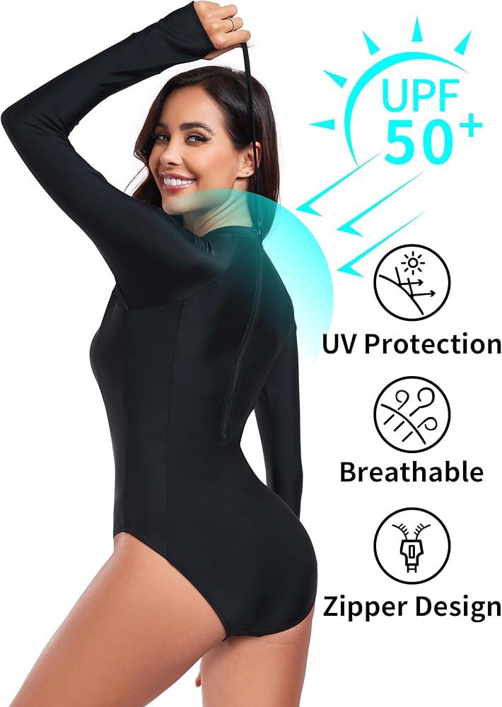 • الأكمام الطويلة مع فتحة الإبهام هي الطريقة المثالية للحماية من أشعة الشمس القاسية مع إظهار مظهر ملابس السباحة الأنيق.