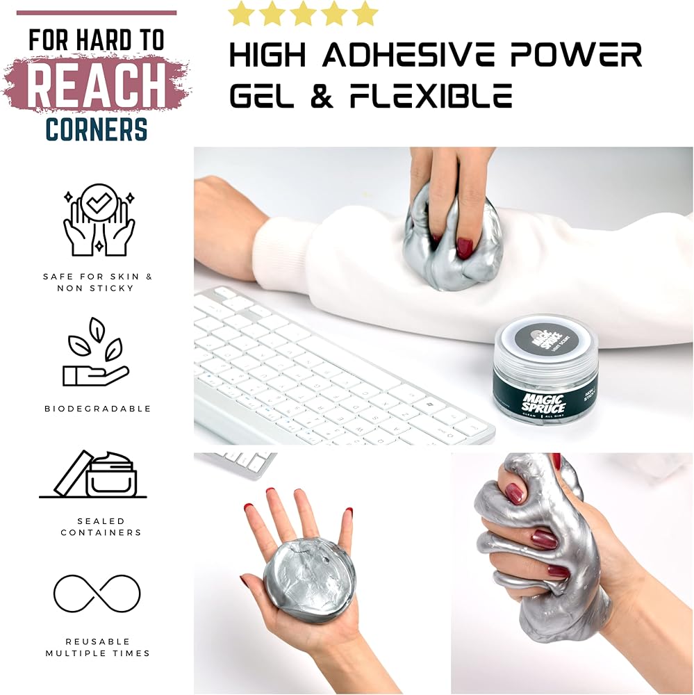 • منظف ​​جميع الزوايا الميتة - إنه سهل الاستخدام، ضعي الجل على الأسطح، ويمكنه الذهاب إلى حيث لا يمكن للطرق التقليدية الأخرى الوصول إليها عندما يتعلق الأمر بالزوايا والرافعات، وإزالة الغبار/الأوساخ من الفجوات والفتحات الصغيرة. منظف ​​مثالي للكمبيوتر المحمول، رائع لتنظيف المناطق في السيارة، وتنظيف منطقة حامل الأكواب، وبلاستيك الكمبيوتر، والهاتف، والكاميرا، ويجعلها تبدو وكأنها جديدة تمامًا.