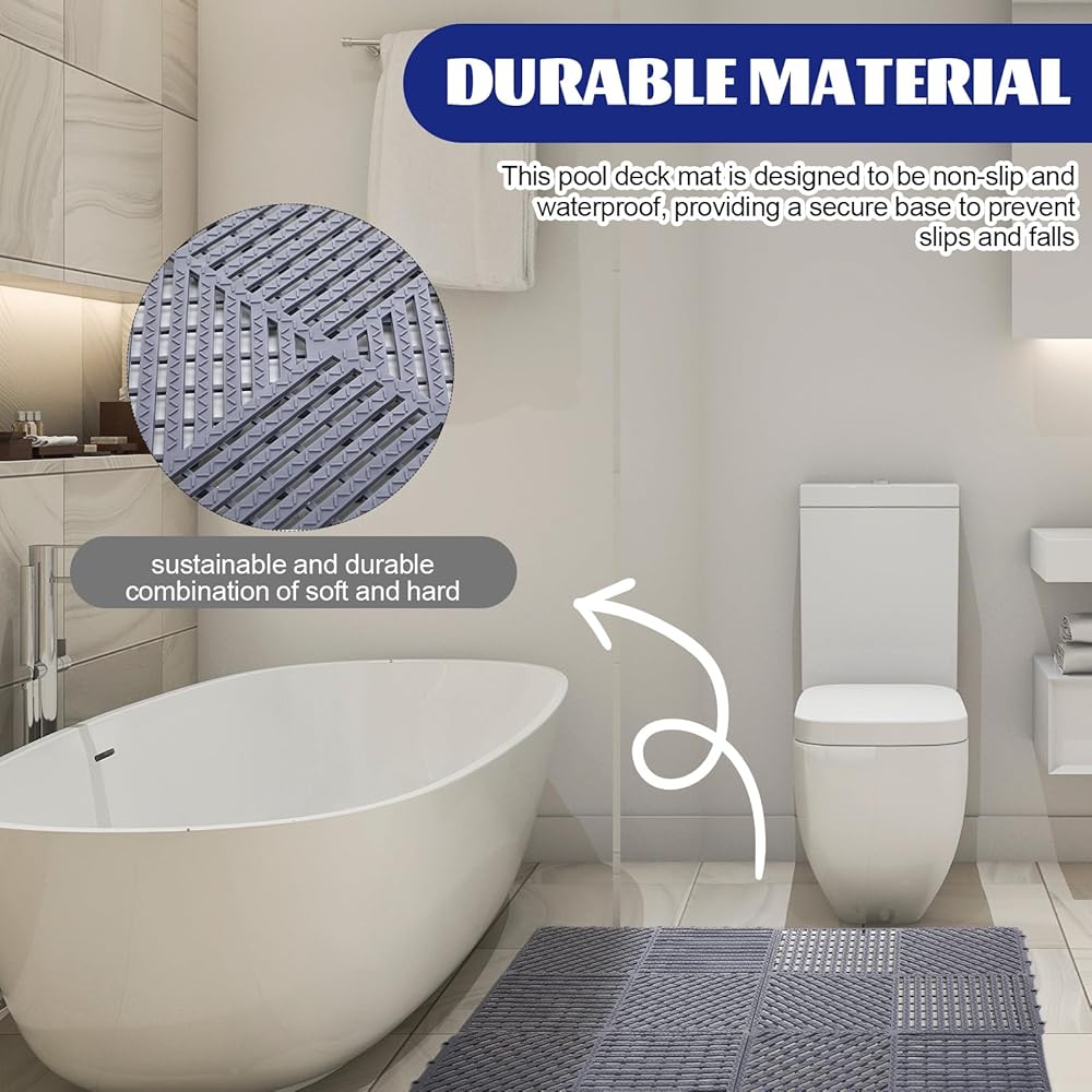 Nonslip and Safe: with a nonslip design, these pool deck mats non slip waterproof provide a secure footing, preventing slips and falls; The textured surface offers enhanced traction, even when exposed to water; This feature makes the interlocking floor mat fit for use in areas such as bathrooms, gyms, kitchens, or some places where safety is paramount