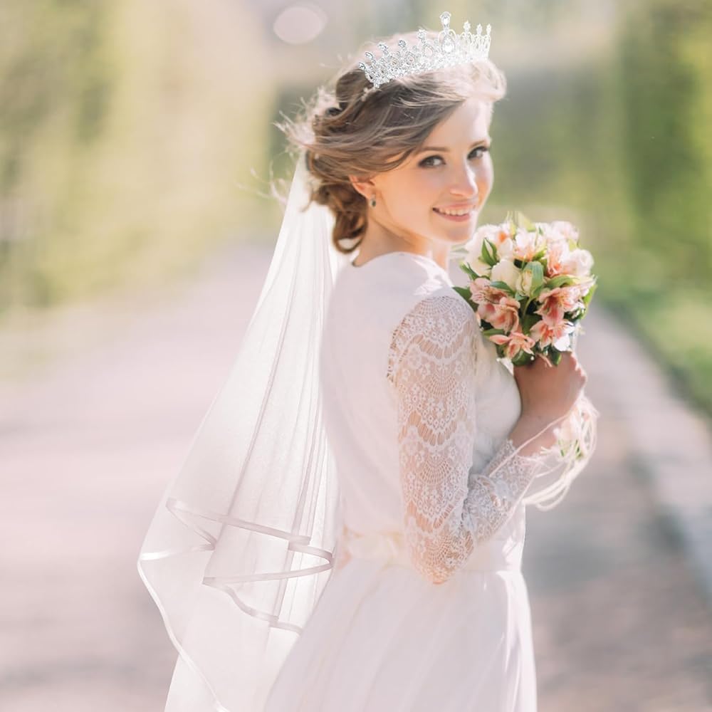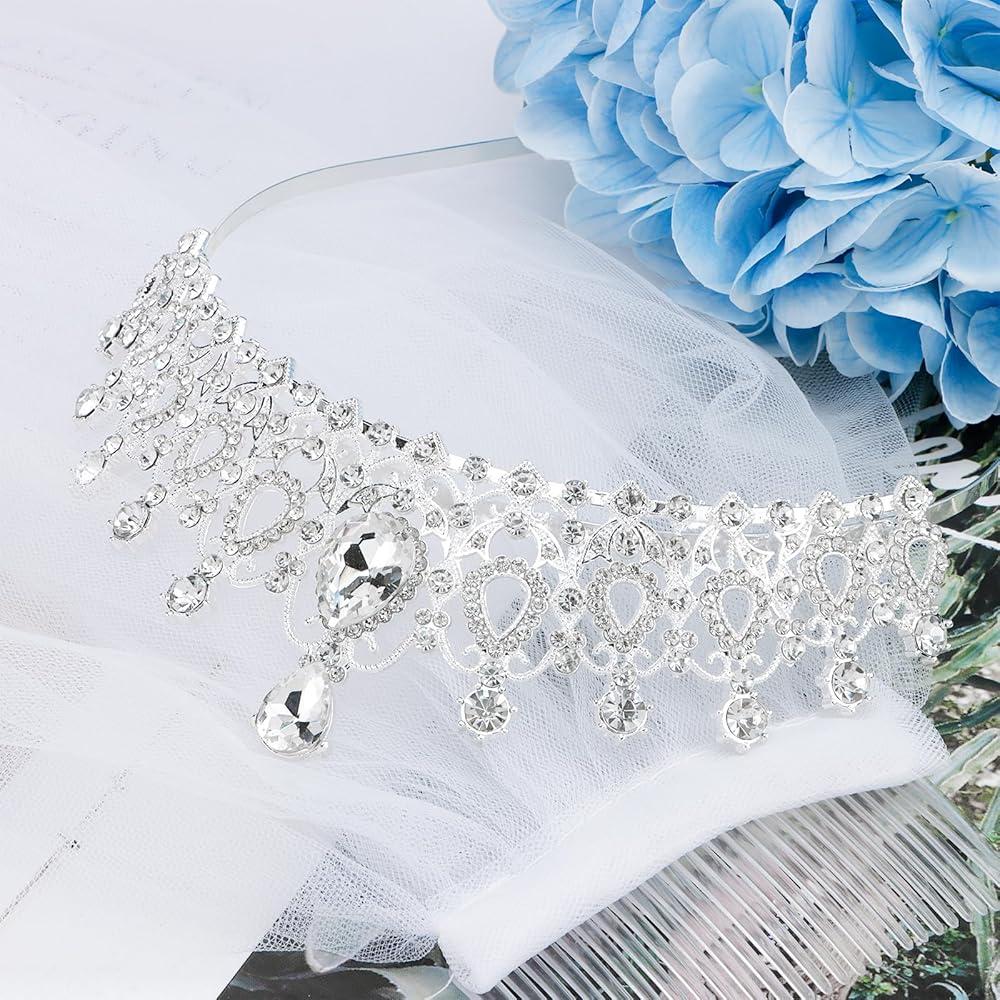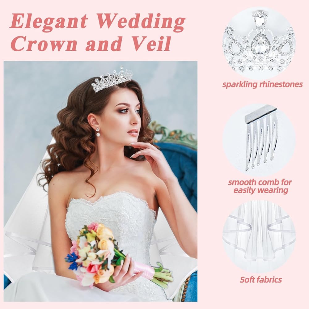زفاف العروس تاج الدانتيل الحجاب للنساء وصيفة العروس، كريستال تيارا والحجاب الأبيض للفتيات حزب العازبة، الأميرة أحجار الراين تاج وحجاب الشعر مجموعة الملحقات لاستحمام الزفاف