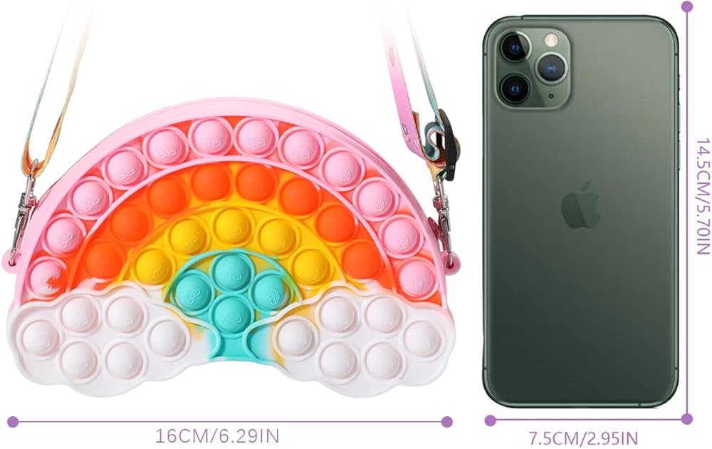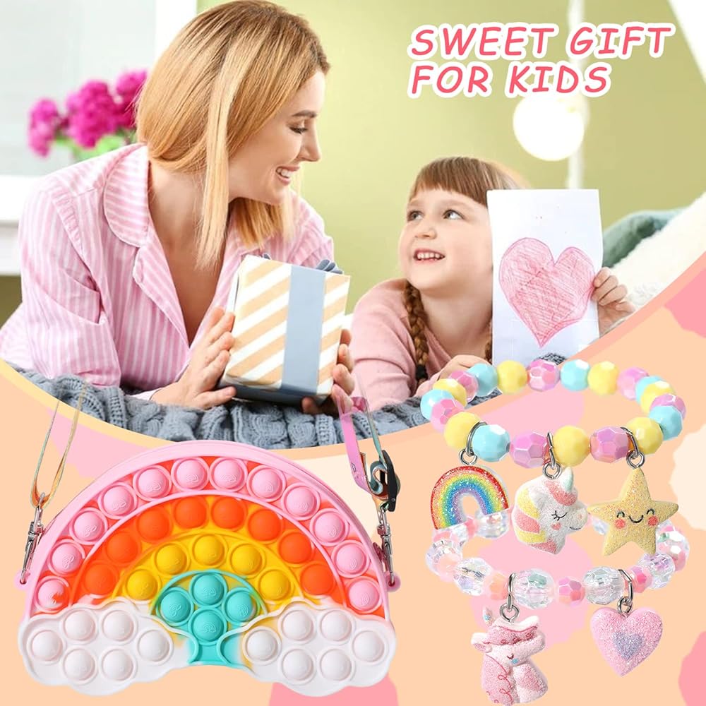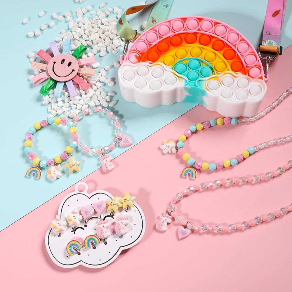 ❀Great Value Suit-- This rainbow purse come with a set of matching 2 unicorn beaded necklace and 2 bracelet. 5 unicorn Meteor ice cream clip-on earring. It's a great value suit.