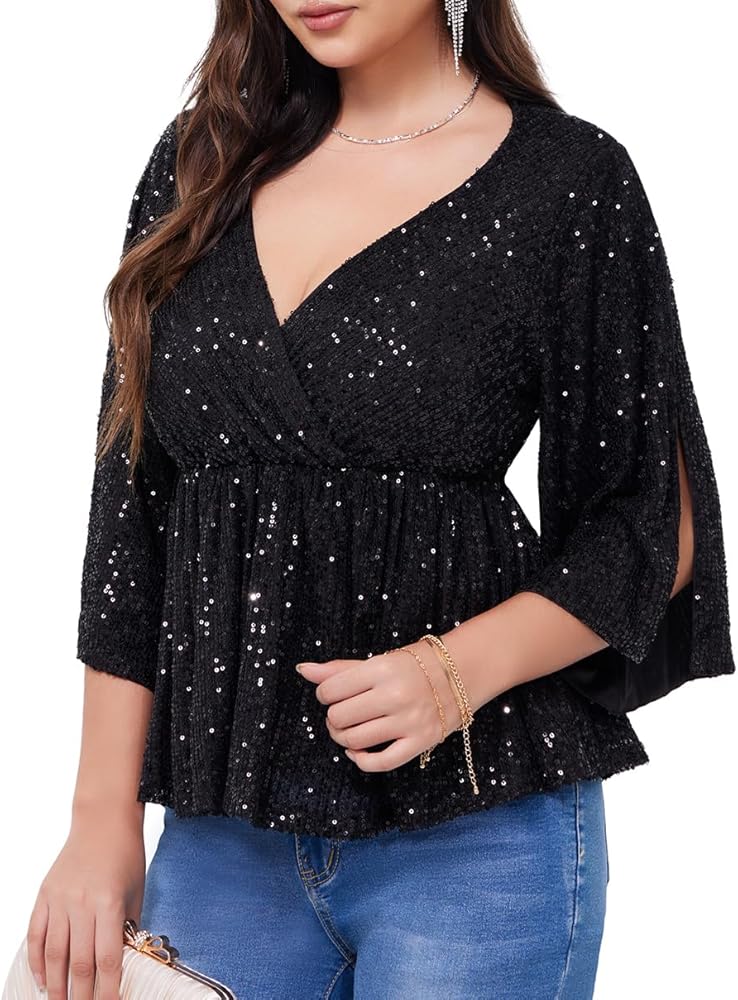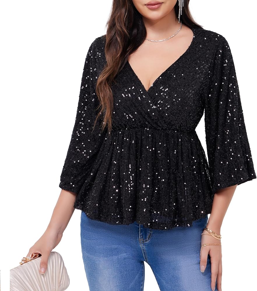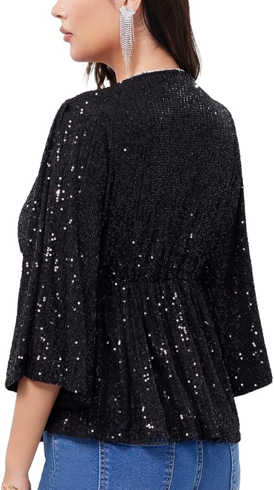 WULFUL Women's Sequin Tops Sparkly V-neck Split 3/4 Sleeve Wrap Peplum Top Party Club Night Out Disco Cocktail Shirts