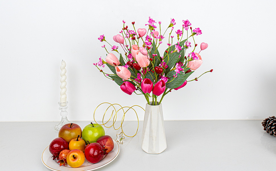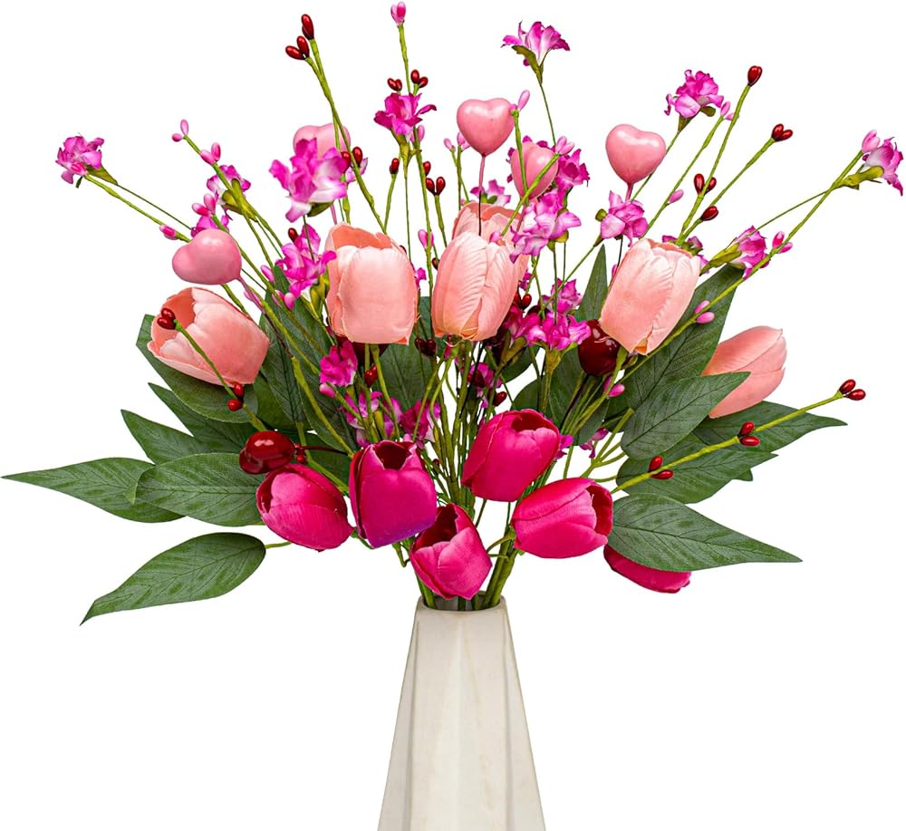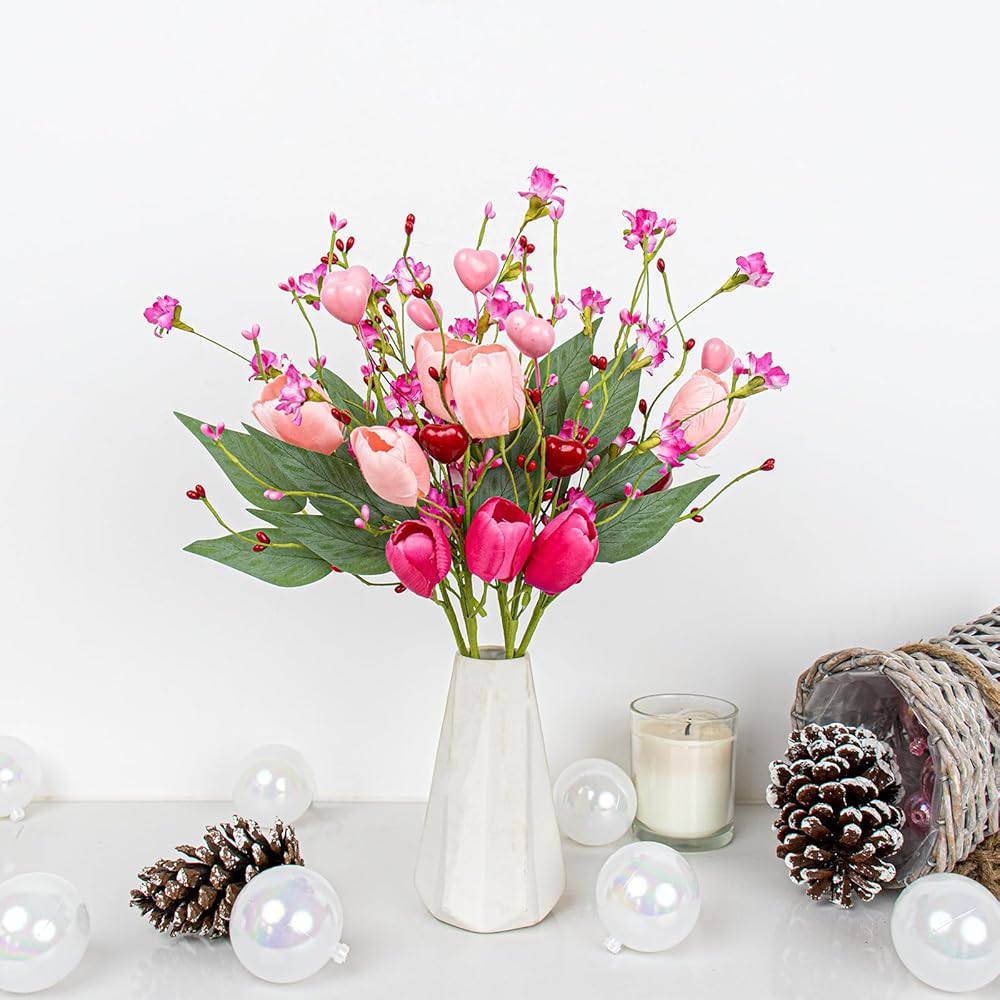 هدايا عيد الحب 6 عبوات من الزهور الاصطناعية في عيد الحب مع زهور التوليب الوردية فورسيثيا الخضراء لعشاء على ضوء الشموع في ذكرى عيد الحب