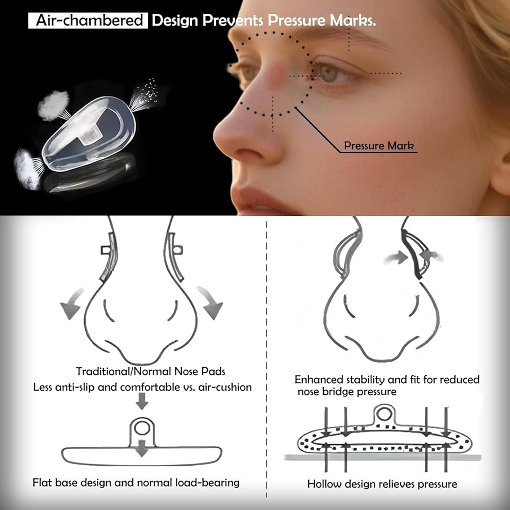 [وسادات أنف من السيليكون عالية الجودة]: تتضمن 3 أنواع و4 أزواج من وسادات الأنف المختلفة. وسائد أنف من السيليكون عالية الجودة، ناعمة، تصميم حجرة هوائية ومريحة بدون روائح كريهة.