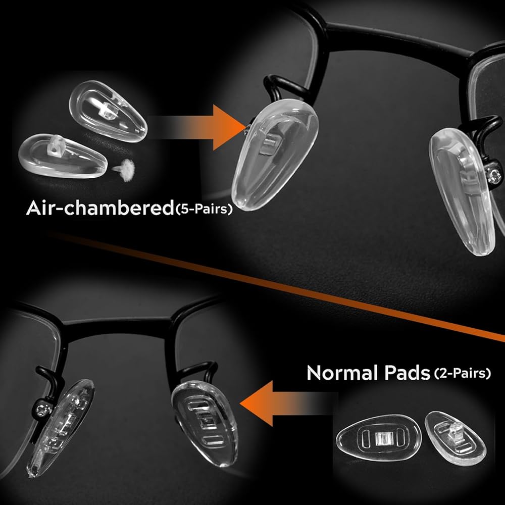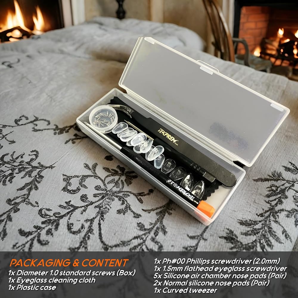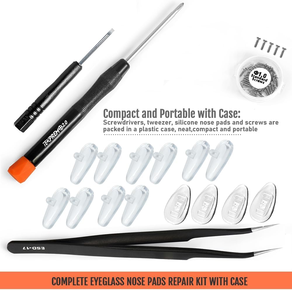 [أدوات إصلاح كاملة]: تتضمن مجموعة الإصلاح هذه جميع الأدوات التي تحتاجها لاستبدال وسادات الأنف. إنهما عبارة عن نوعين من المفكات، وصندوق واحد من براغي وسادات الأنف، وزوج واحد من الملقط المنحني، وقطعة واحدة من نظارات الألياف الدقيقة المخصصة للتنظيف.