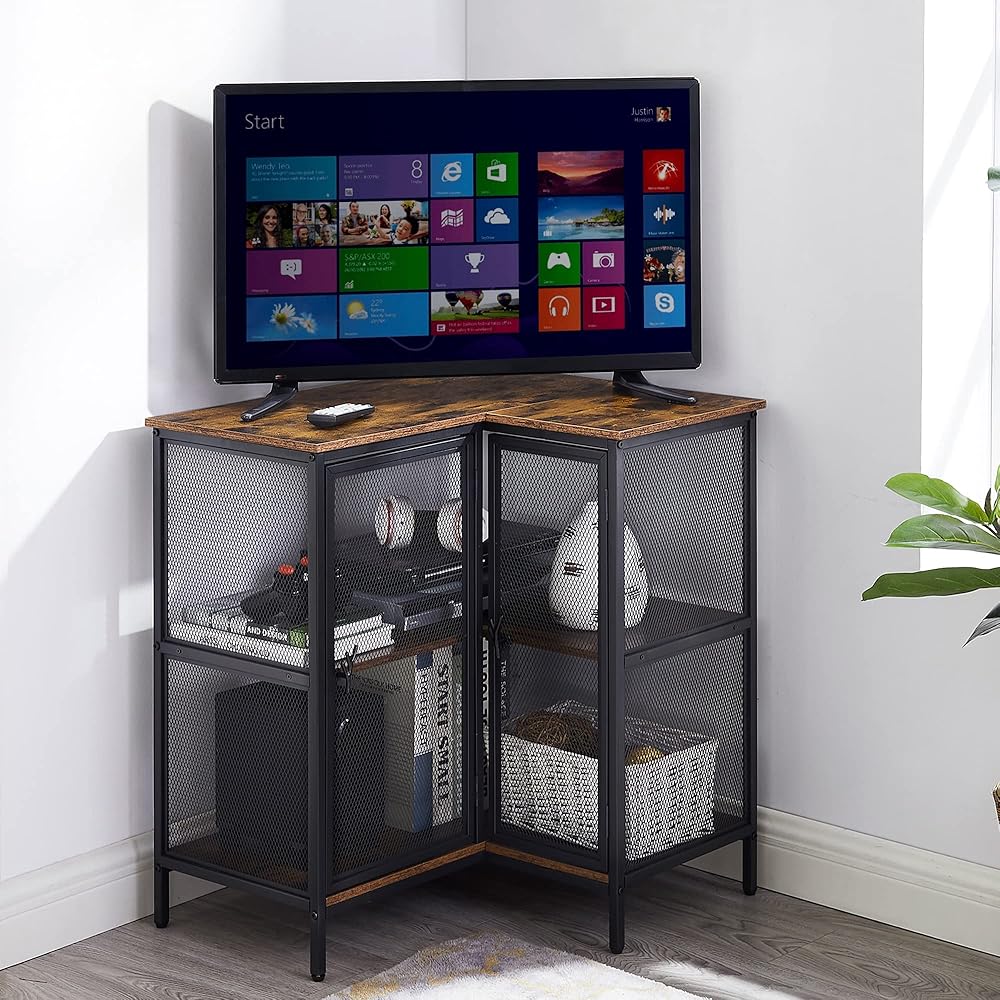 vecelo خزانة زاوية من 3 طبقات مع أبواب وأرفف تخزين، حامل تلفزيون صناعي متعدد الأغراض، طاولة قائمة بذاتها، لغرفة المعيشة الصغيرة والمنزل والمكتب والمطبخ، بني ريفي