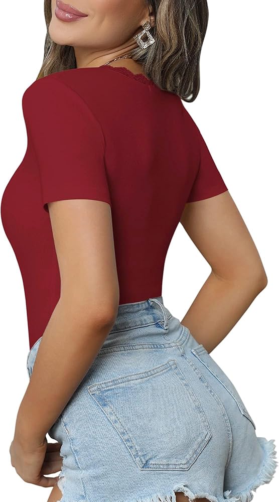MANGOPOP V Neck Bodysuits for Women Folded Over Short Sleeve Going out Tops