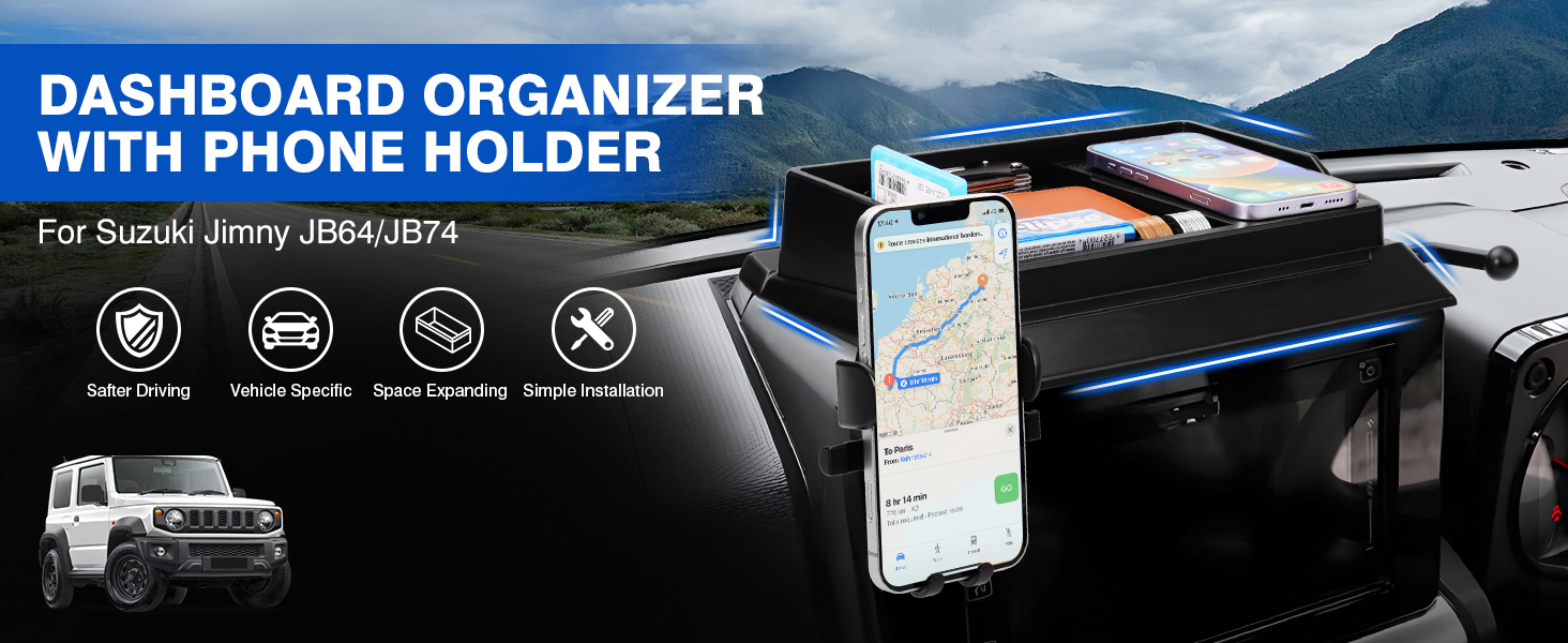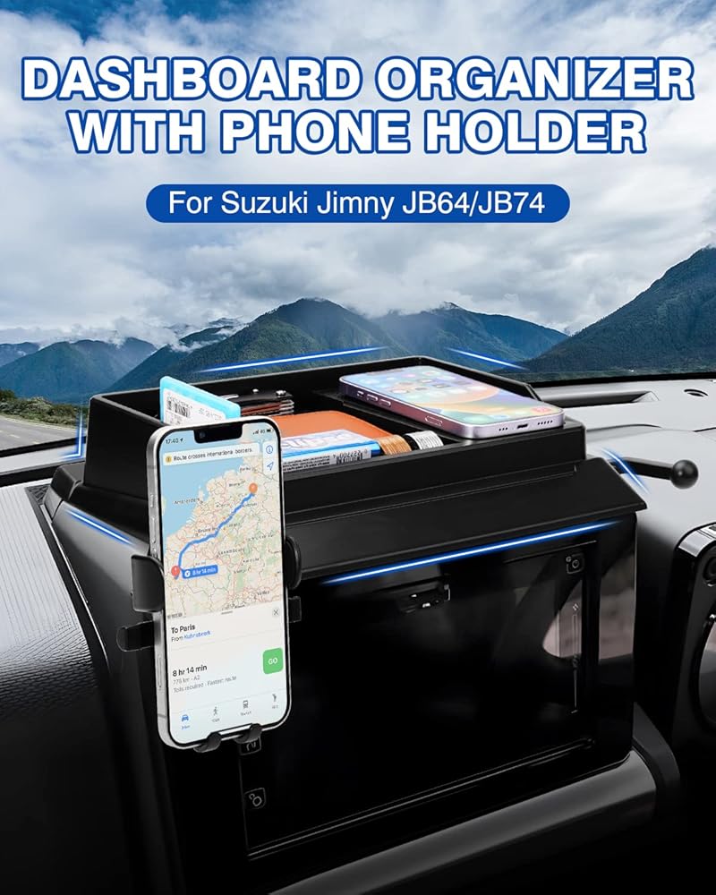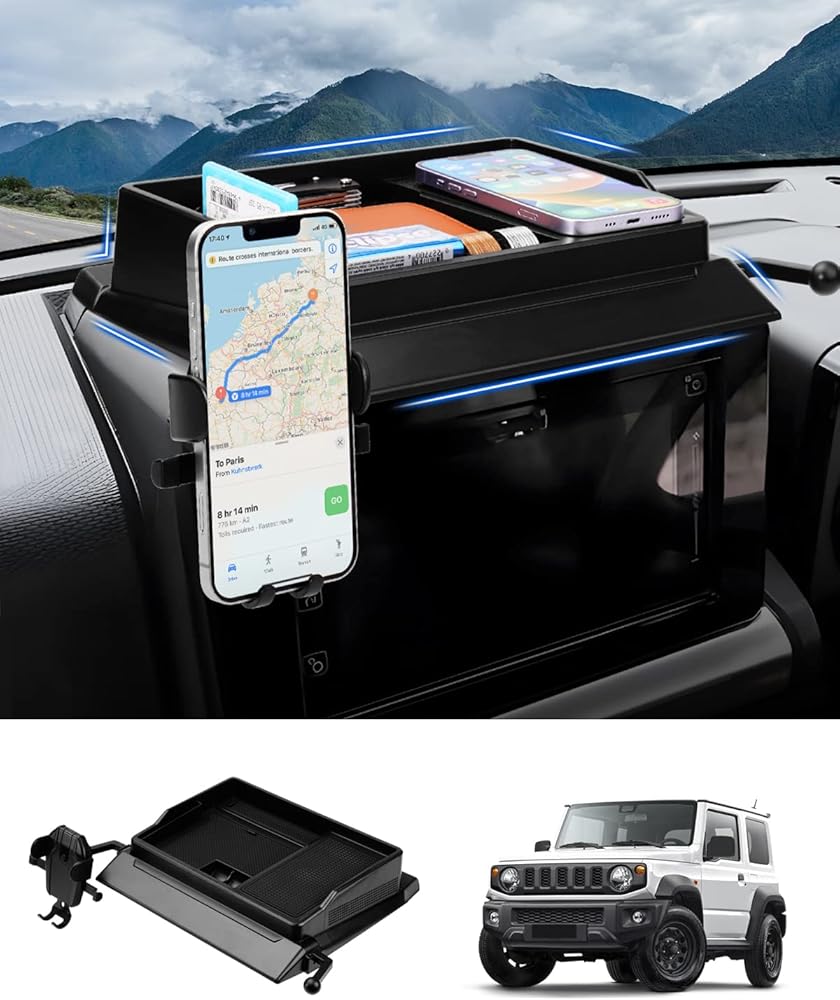 خاص بجيمني: حامل هاتف رائع مع صندوق تخزين لسوزوكي جيمي JB64 JB74 2019 2020 2021 2022 2023 2024 2025. بفضل هيكلها المتين وميزاتها المريحة، فهي ملحقات مطلقة لقيادتك اليومية.