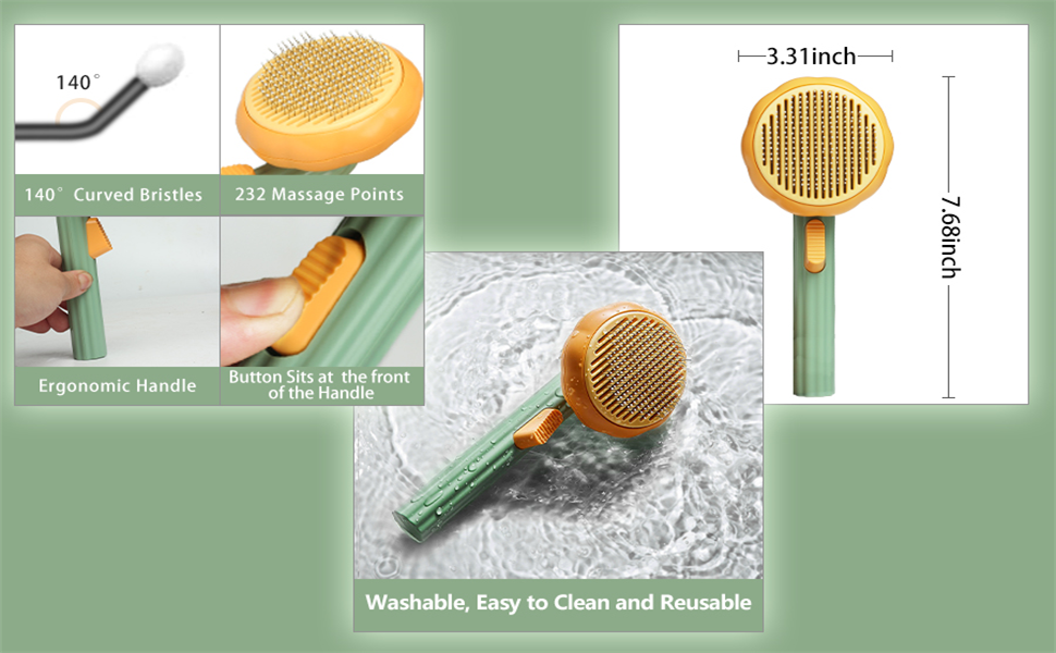 • 【تصميم علمي】الفرشاة قابلة للغسل. الشعيرات المصنوعة من الفولاذ المقاوم للصدأ منحنية بمقدار 140 درجة بزاوية يمكنها اختراق الطبقة السفلية بعمق. 184 طرفًا مطاطيًا على الشعيرات ستحمي جلد الحيوان الأليف تمامًا.