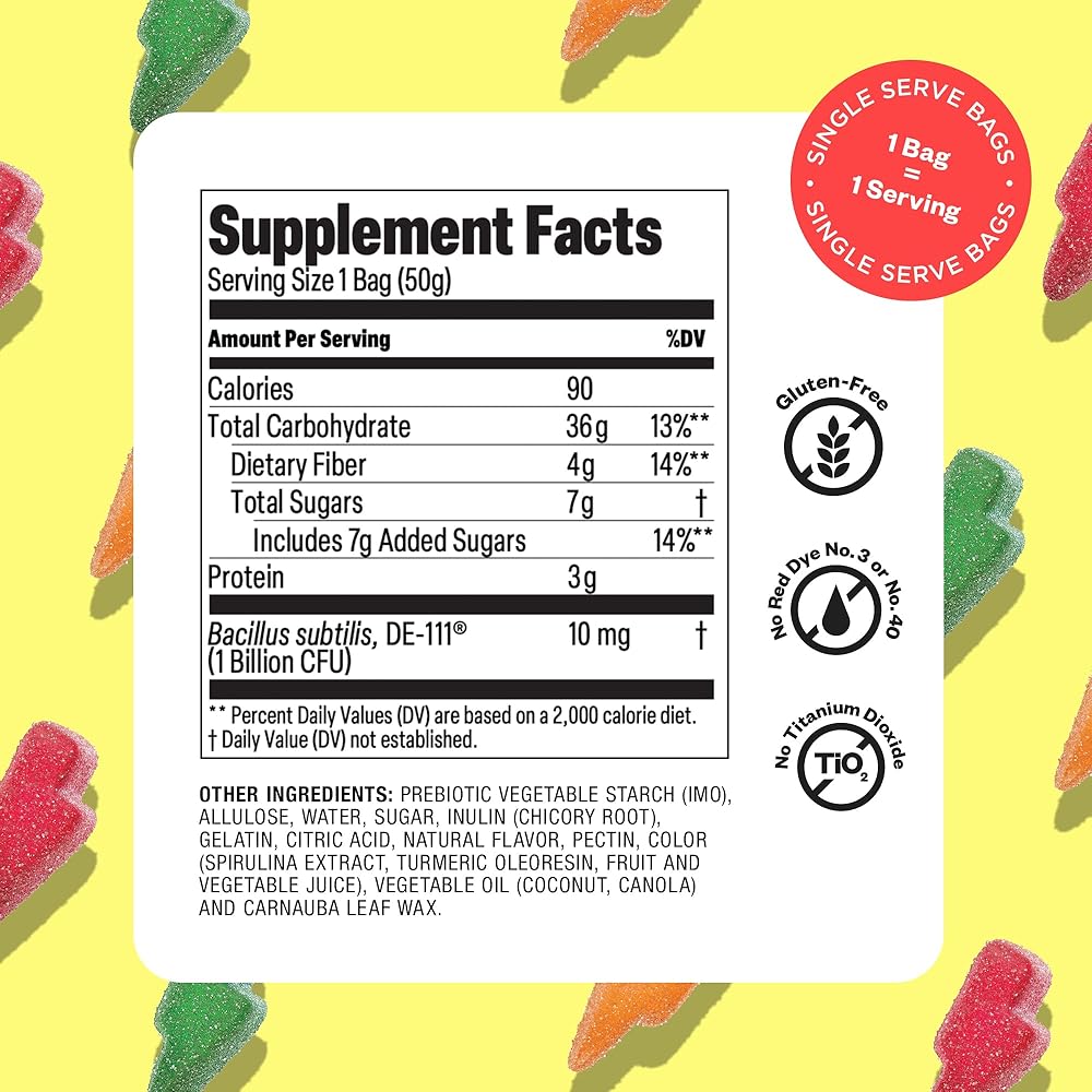 لماذا ستحبينها: ها نحن ذا...90 سعرة حرارية لكل كيس. أفضل نسيج مطاطي. محلاة بألياف البريبايوتك. بنكهة النكهات الطبيعية. الألوان من الفواكه والخضروات. خالي من ثاني أكسيد التيتانيوم والصبغة الحمراء رقم 3 والصبغة الحمراء رقم 40.