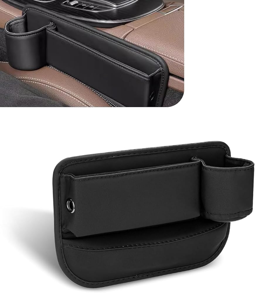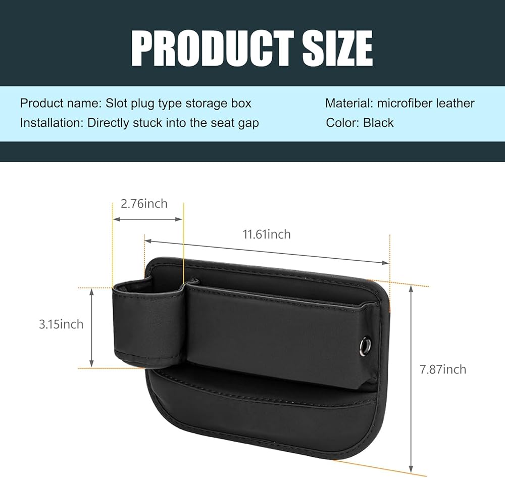 Product Information: This car seat organizer has a good texture that feels smooth and soft. The package includes 1 piece of the car seat gap organizer. The size of the car seat gap filler organizer is 11.6" x 7.8". The water cup holder is 2.7" width and 3.1" height. It is universal for most cars.