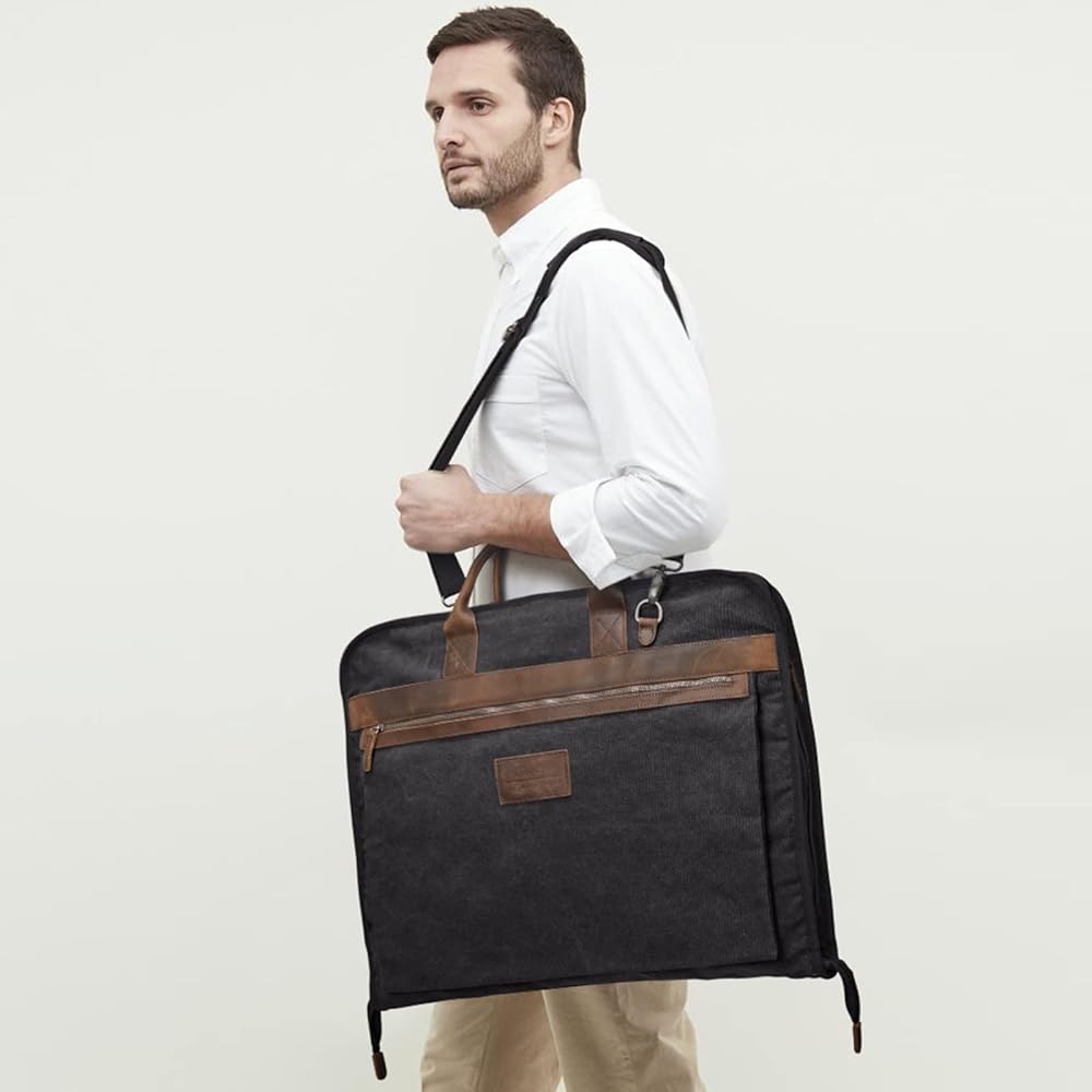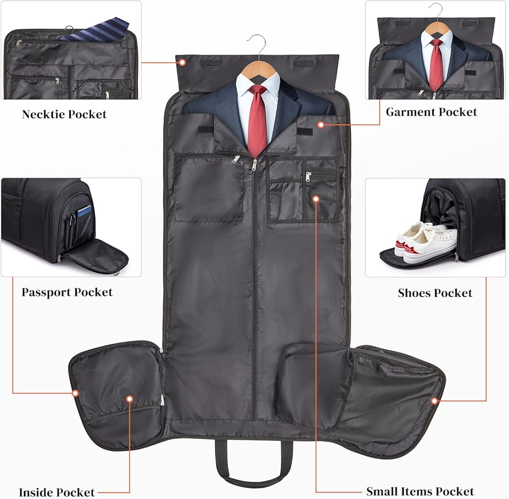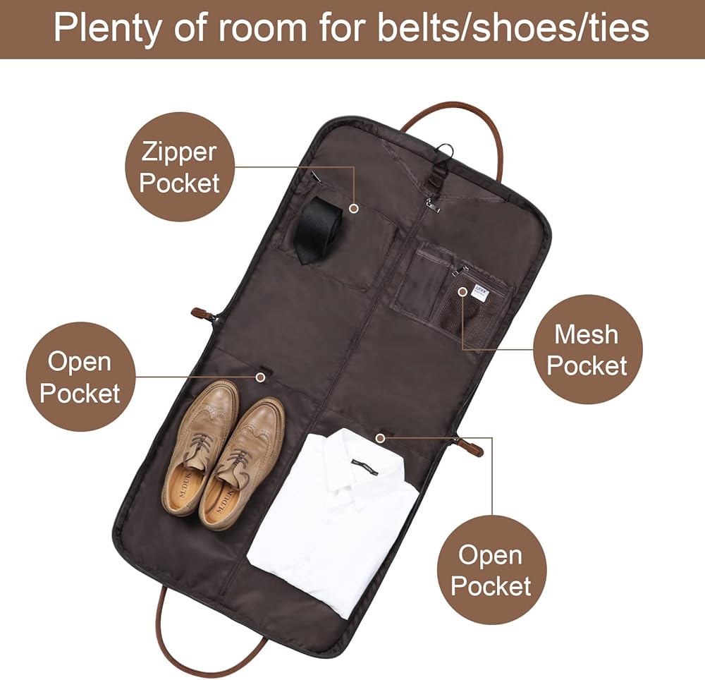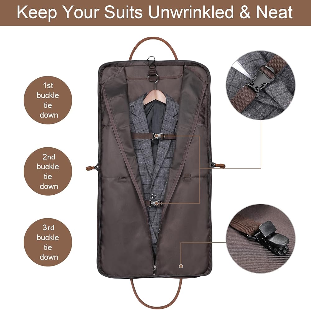حقيبة ملابس لهياكل السفر وتفاصيلها: تتميز بجيوب متعددة مصممة لحمل ثلاث بدلات وأساسيات العمل. 3 حلقات لتعليق البدلات؛ حزام قابل للتعديل مزود بإبزيم ومشابك يبقي بدلاتك غير مجعدة وأنيقة؛ 5 جيوب داخلية للأحذية وربطات العنق والجوارب والإكسسوارات الصغيرة؛ جيبان خارجيان مصنوعان بشكل جيد ويسهل الوصول إليهما لمجلات السفر وجواز السفر والأقلام والهاتف الذكي والتذاكر وغيرها من العناصر. إنها حقيبة حمل مثالية لمسافري الأعمال