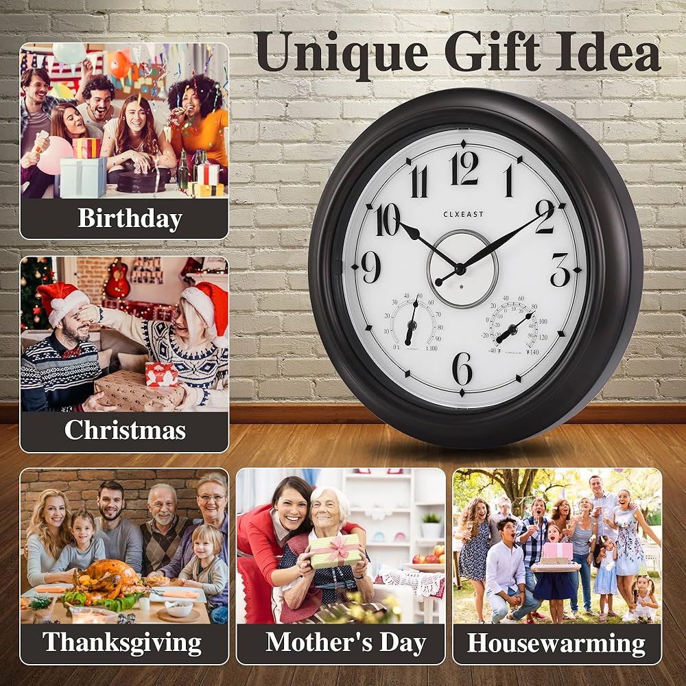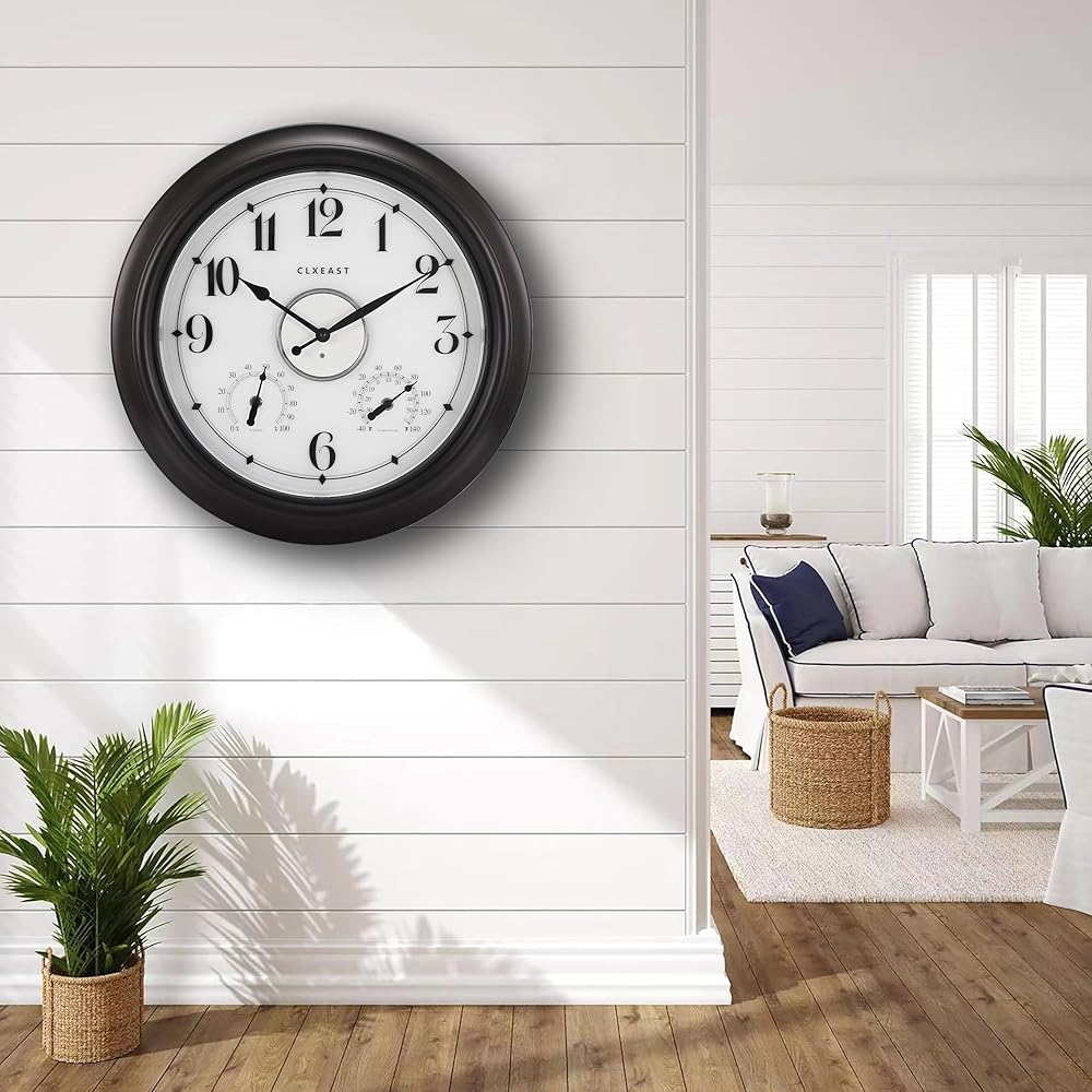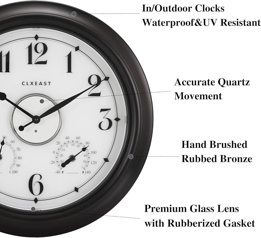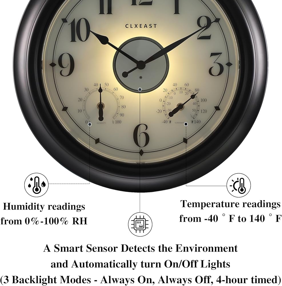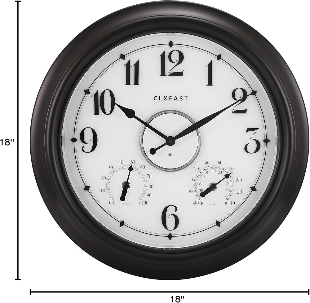ساعات CLXEAST مضيئة للاستخدام الداخلي والخارجي مقاومة للماء 18 بوصة مع مستشعر ذكي، ساعة حائط كبيرة مع مقياس حرارة ومقياس رطوبة لحوض سباحة الفناء والحديقة، أسود برونزي مطلي بالزيت